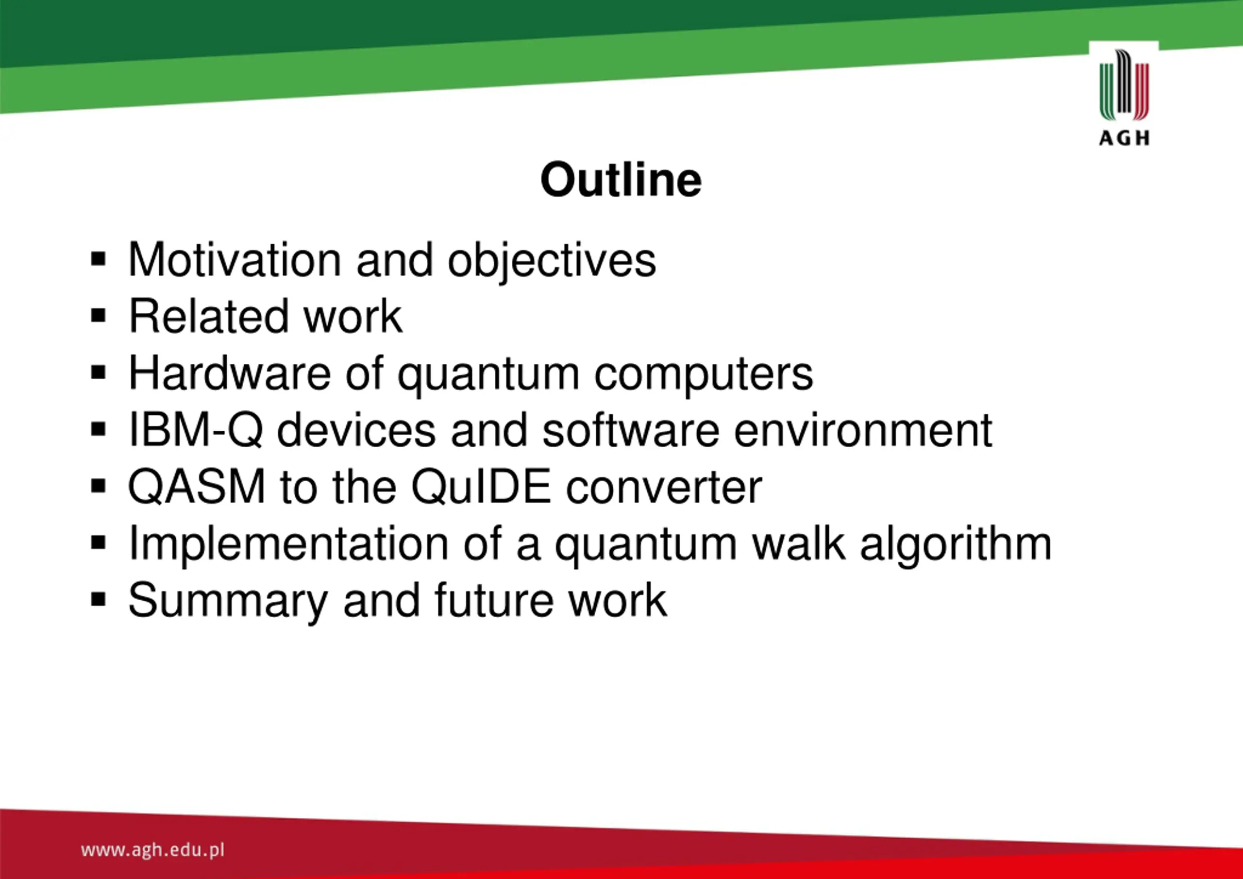 Outline Motivation and objectives Related work Hardware of quantum computers IBM-Q devices and software environment QASM to the QuIDE converter Implementation of a quantum walk algorithm Summary and future work