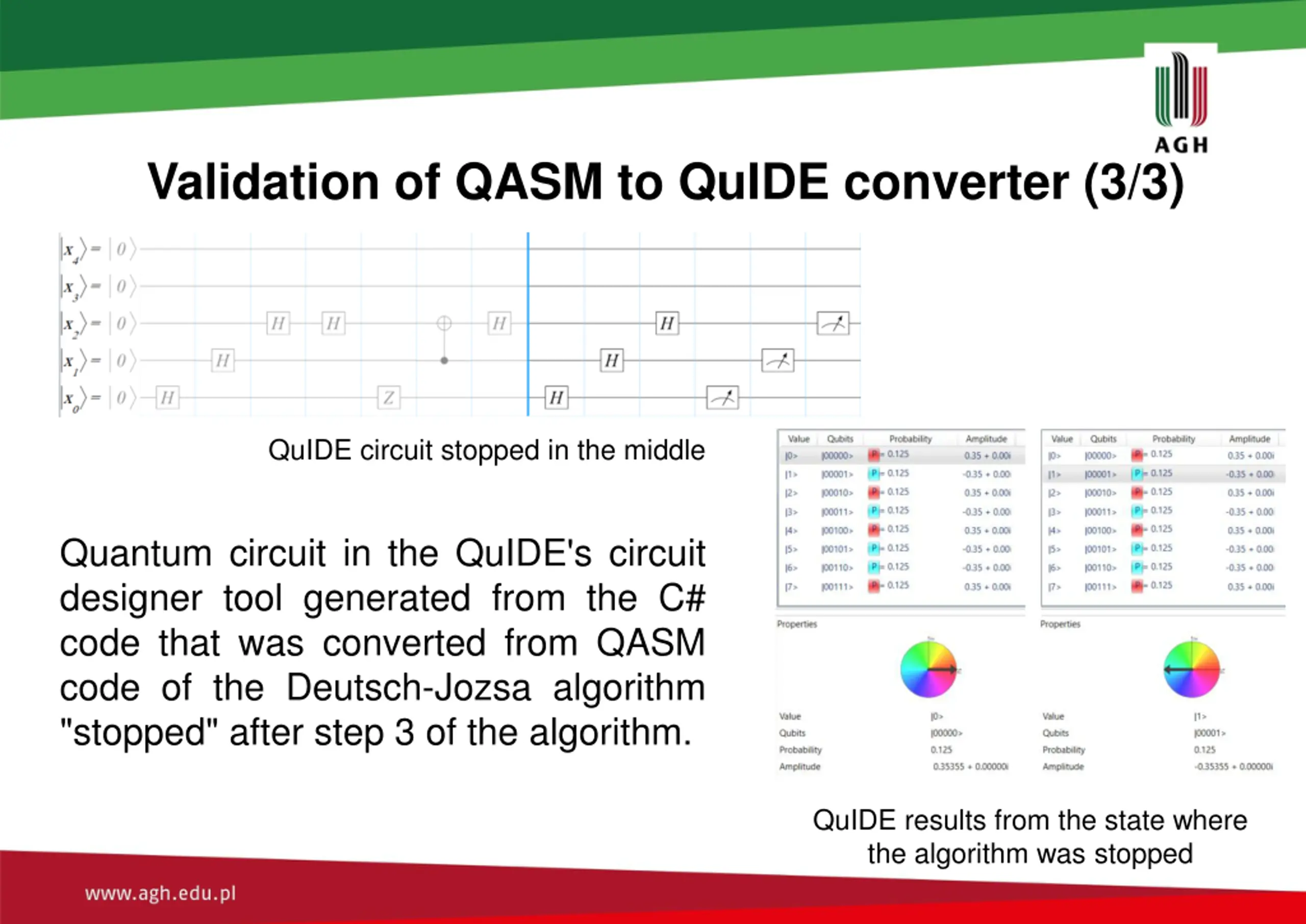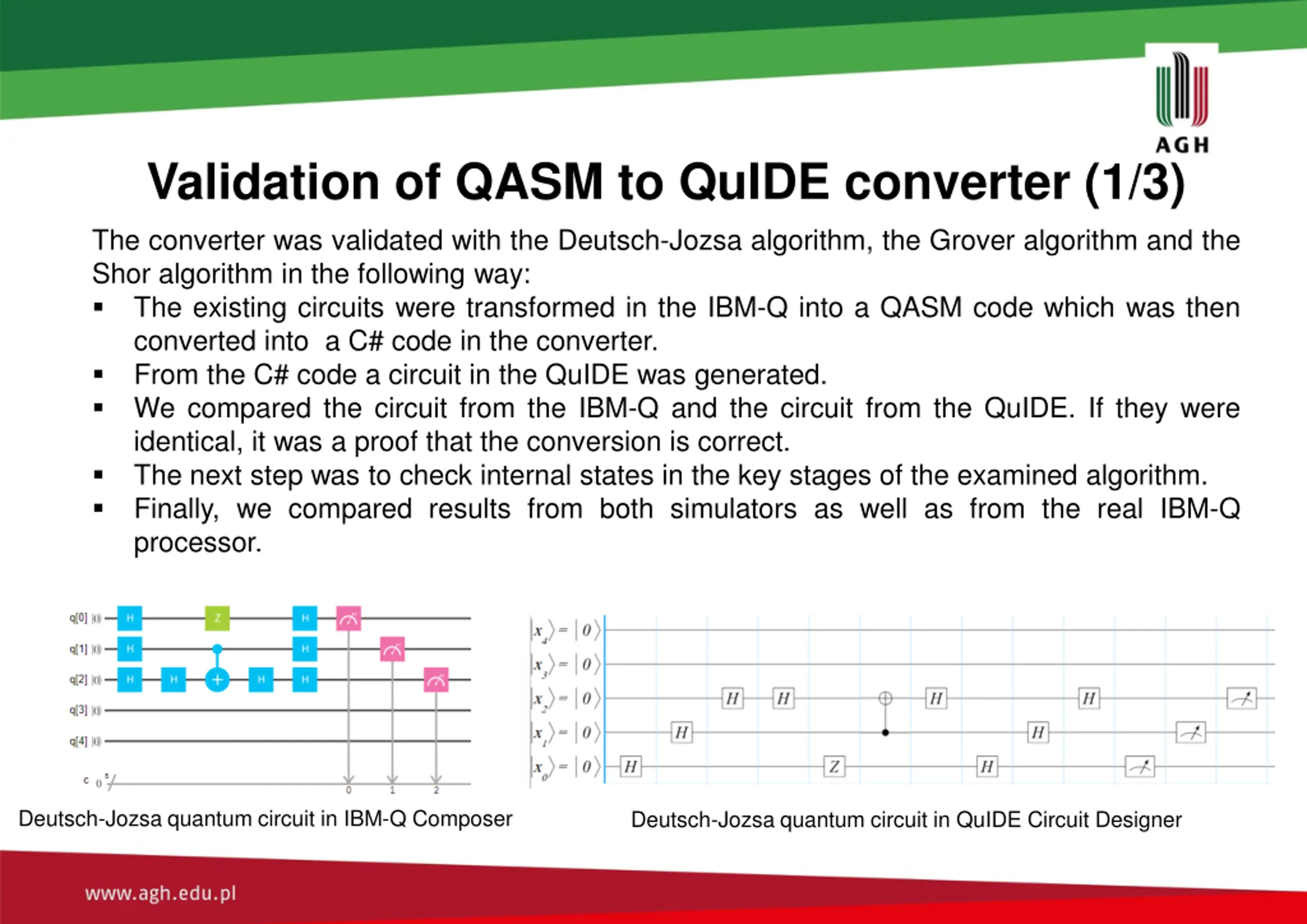 Validation of QASM to QuIDE converter (1/3) The converter was validated with the Deutsch-Jozsa algorithm, the Grover algorithm and the Shor algorithm in the following way: The existing circuits were transformed in the IBM-Q into a QASM code which was then converted into a C# code in the converter. From the C# code a circuit in the QuIDE was generated. We compared the circuit from the IBM-Q and the circuit from the QuIDE. If they were identical, it was a proof that the conversion is correct. The next step was to check internal states in the key stages of the examined algorithm. Finally, we compared results from both simulators as well as from the real IBM-Q processor. Deutsch-Jozsa quantum circuit in IBM-Q Composer Deutsch-Jozsa quantum circuit in QuIDE Circuit Designer