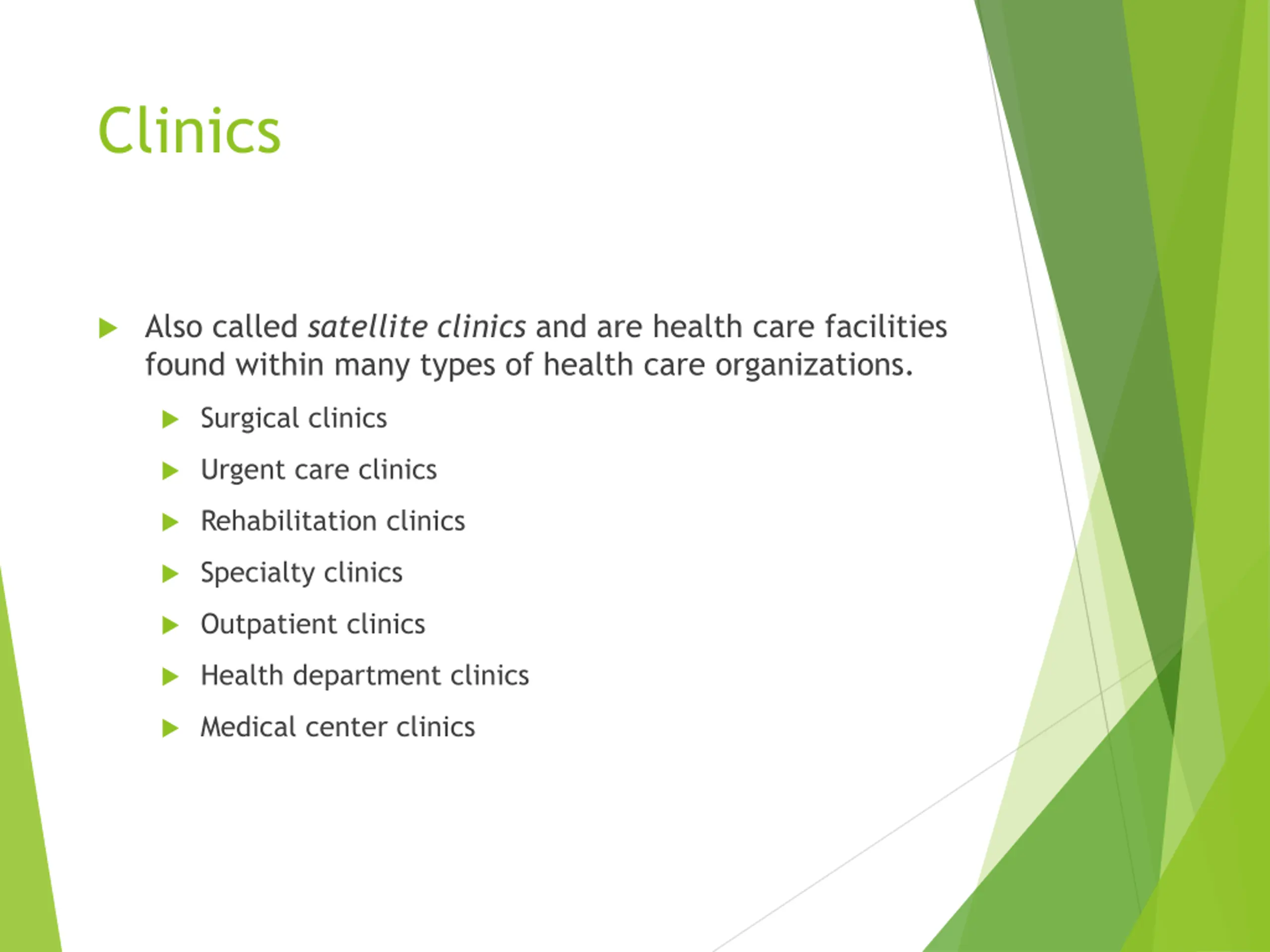 Clinics Also called satellite clinics and are health care facilities found within many types of health care organizations. Surgical clinics Urgent care clinics Rehabilitation clinics Specialty clinics Outpatient clinics Health department clinics Medical center clinics