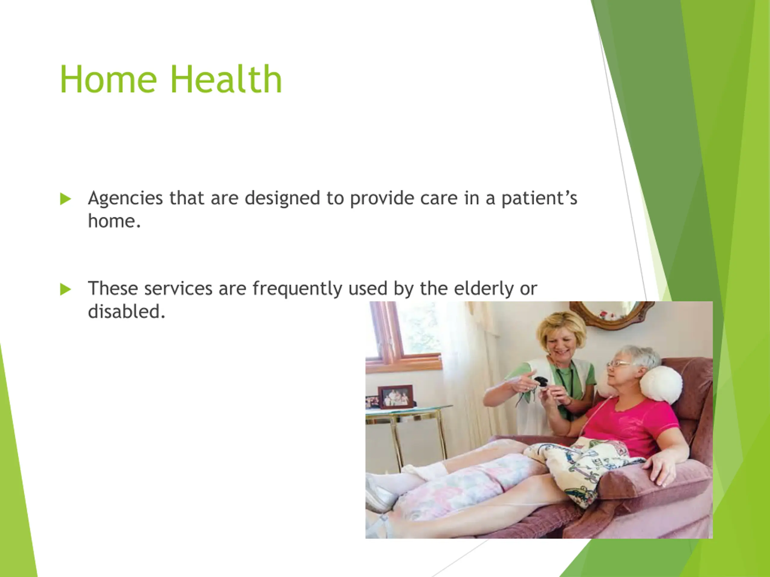 Home Health Agencies that are designed to provide care in a patient s home. These services are frequently used by the elderly or disabled.