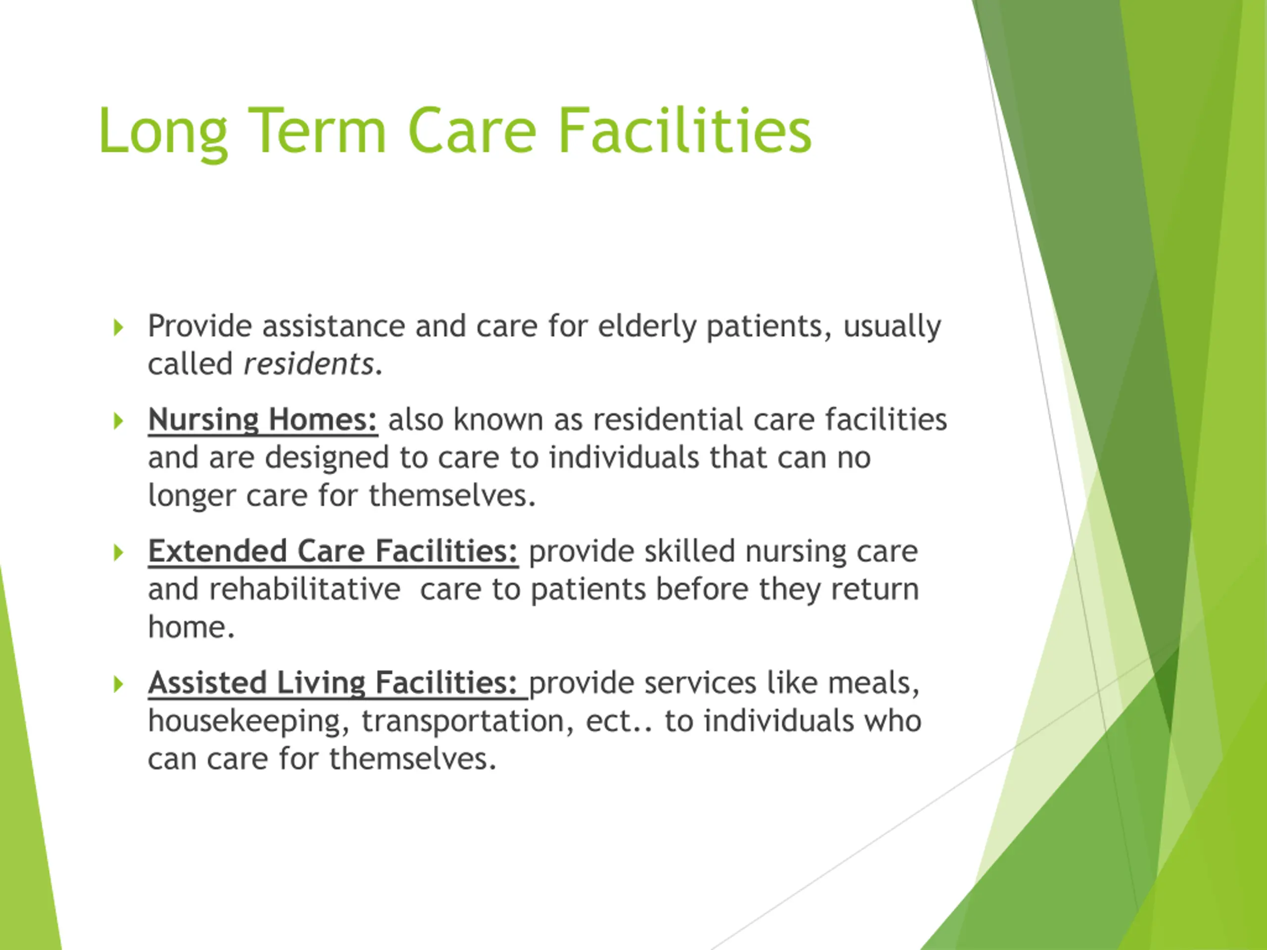 Long Term Care Facilities Provide assistance and care for elderly patients, usually called residents. Nursing Homes: also known as residential care facilities and are designed to care to individuals that can no longer care for themselves. Extended Care Facilities: provide skilled nursing care and rehabilitative care to patients before they return home. Assisted Living Facilities: provide services like meals, housekeeping, transportation, ect.. to individuals who can care for themselves.