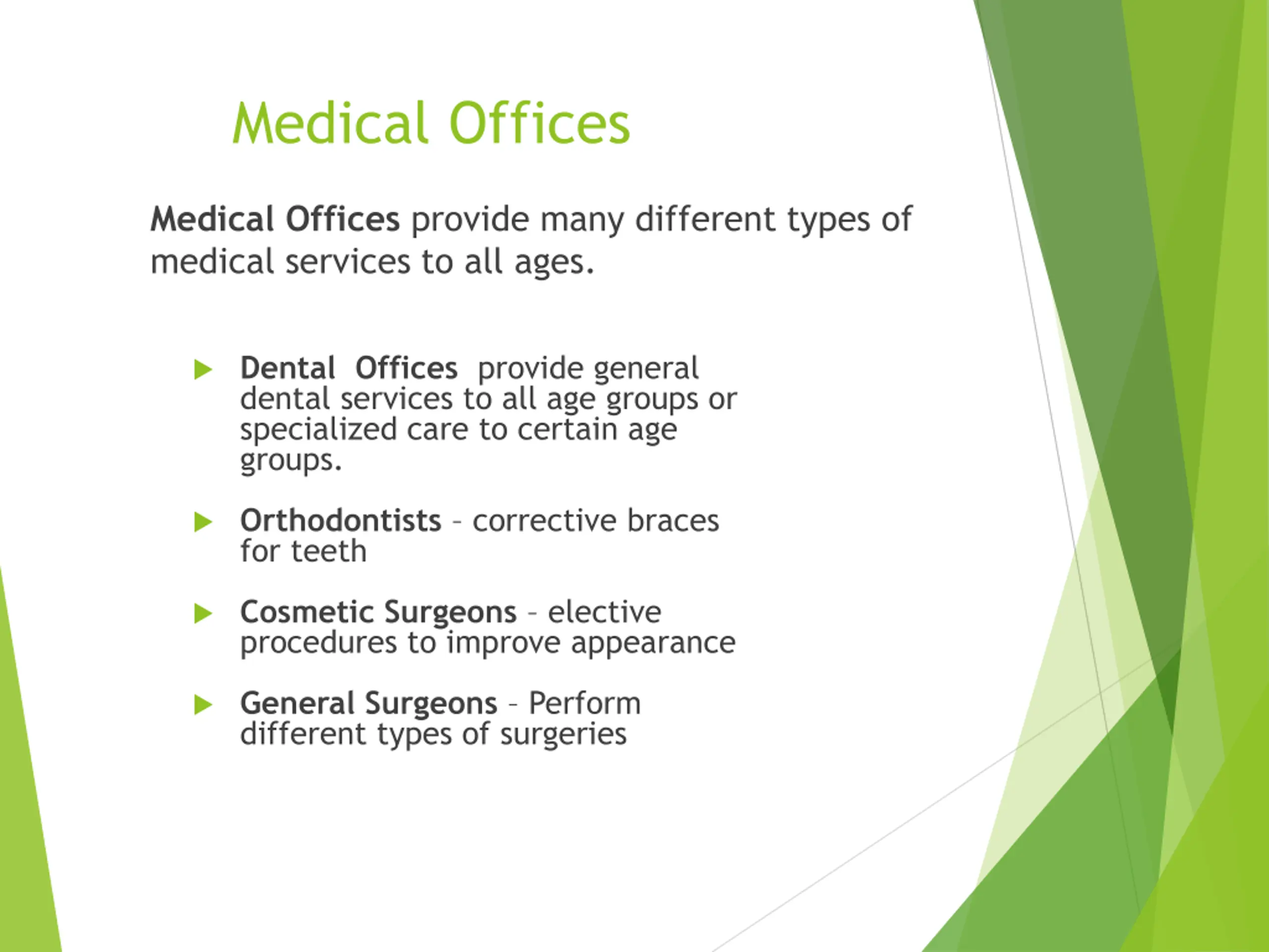 Medical Offices Medical Offices provide many different types of medical services to all ages. Dental Offices provide general dental services to all age groups or specialized care to certain age groups. Orthodontists corrective braces for teeth Cosmetic Surgeons elective procedures to improve appearance General Surgeons Perform different types of surgeries