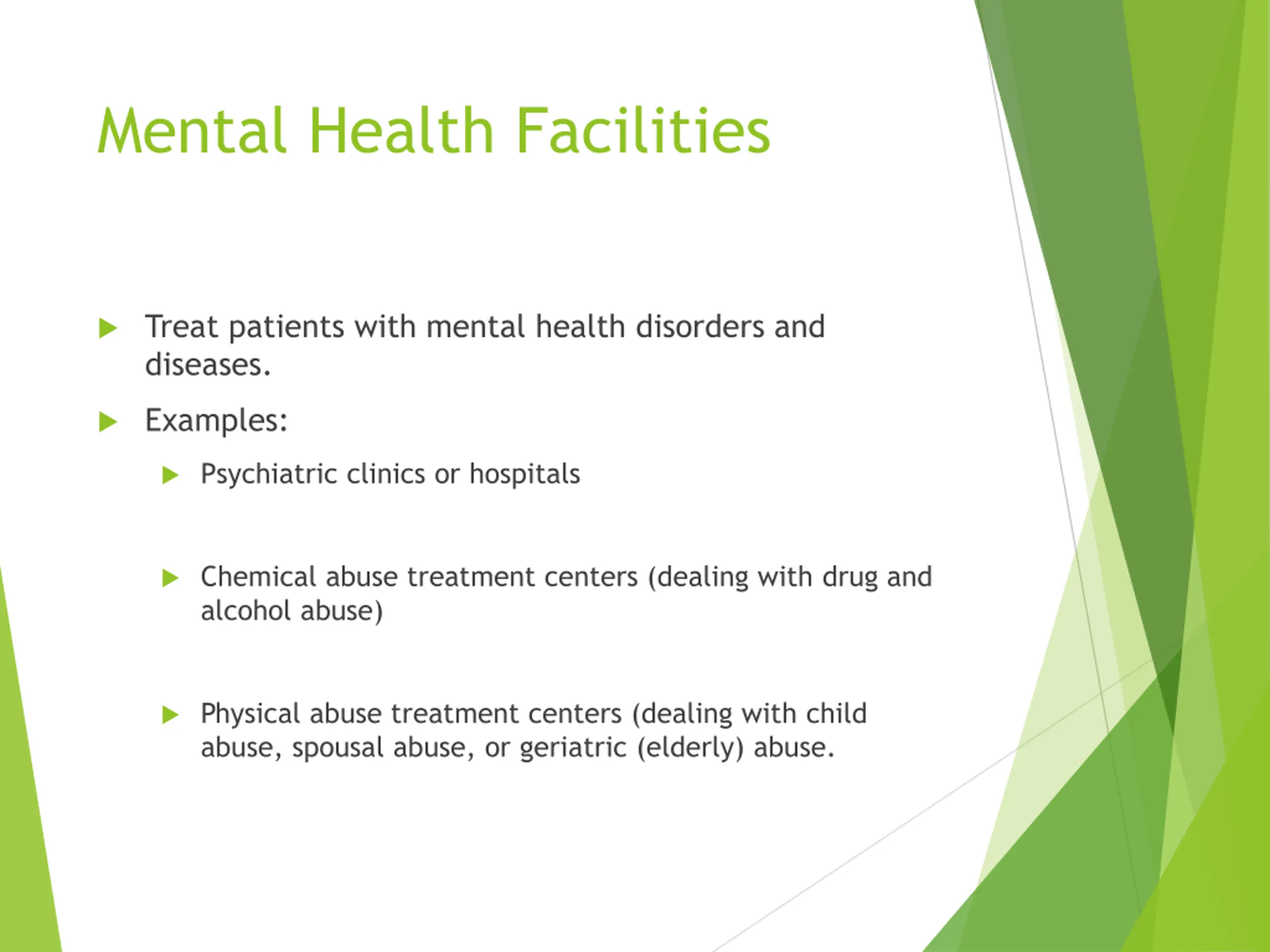 Mental Health Facilities Treat patients with mental health disorders and diseases. Examples: Psychiatric clinics or hospitals Chemical abuse treatment centers (dealing with drug and alcohol abuse) Physical abuse treatment centers (dealing with child abuse, spousal abuse, or geriatric (elderly) abuse.