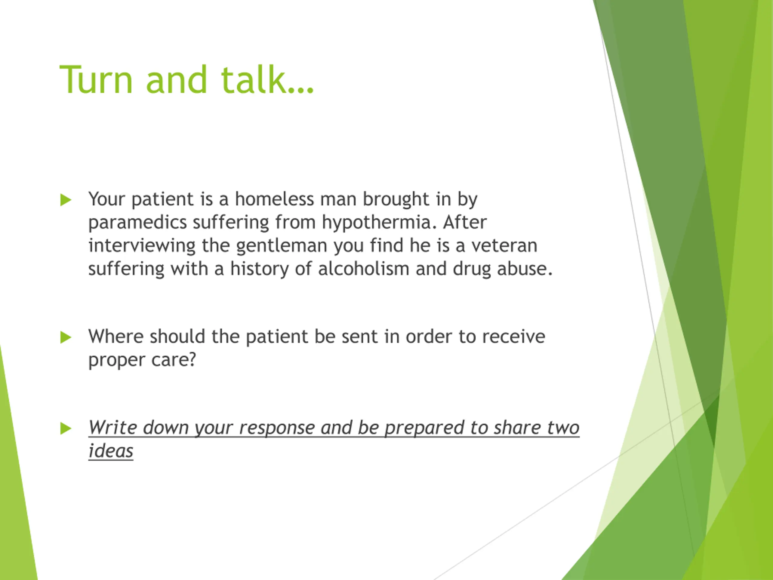 Turn and talk Your patient is a homeless man brought in by paramedics suffering from hypothermia. After interviewing the gentleman you find he is a veteran suffering with a history of alcoholism and drug abuse. Where should the patient be sent in order to receive proper care? Write down your response and be prepared to share two ideas