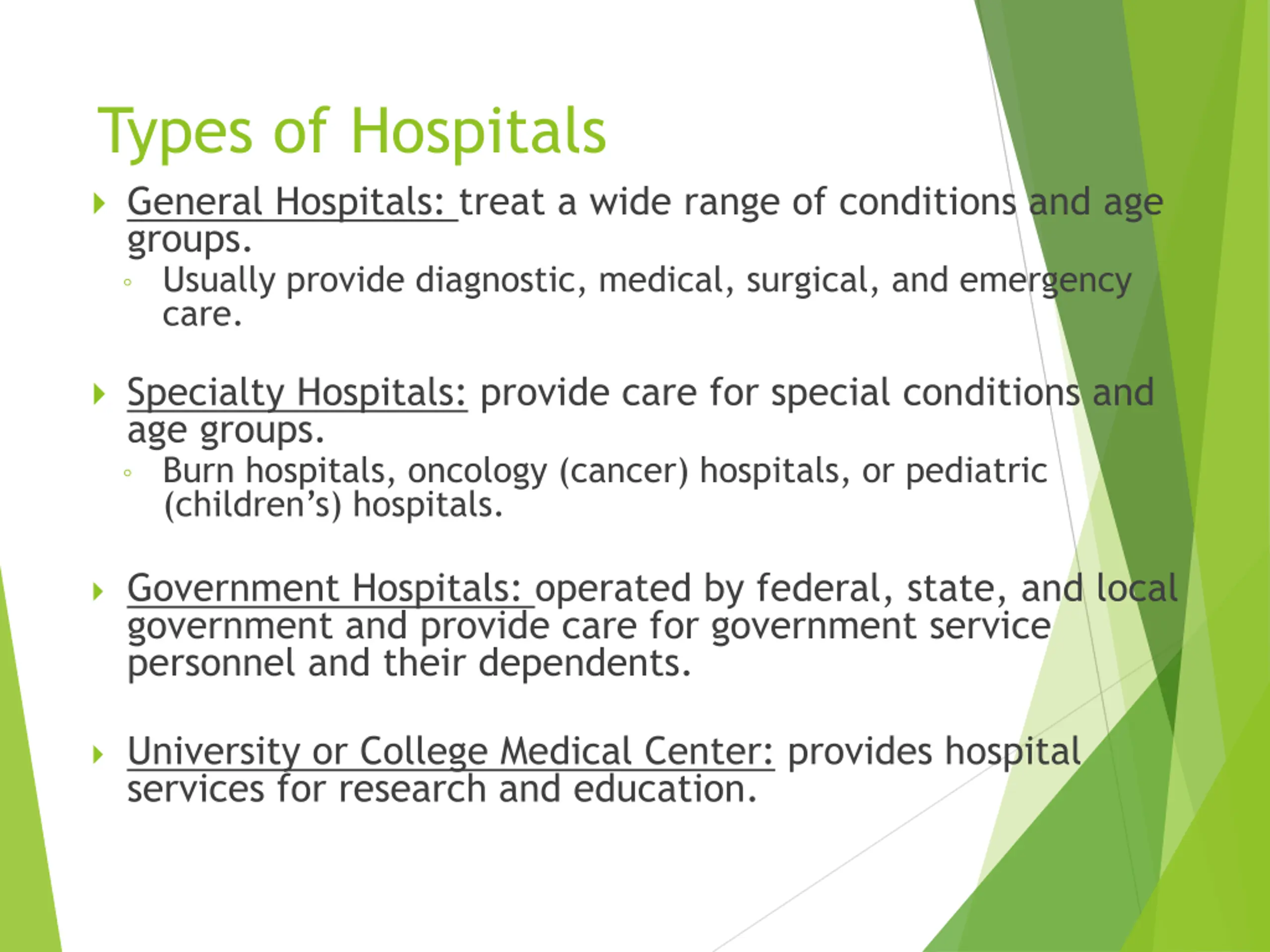 Types of Hospitals General Hospitals: treat a wide range of conditions and age groups. Usually provide diagnostic, medical, surgical, and emergency care. Specialty Hospitals: provide care for special conditions and age groups. Burn hospitals, oncology (cancer) hospitals, or pediatric (children s) hospitals. Government Hospitals: operated by federal, state, and local government and provide care for government service personnel and their dependents. University or College Medical Center: provides hospital services for research and education.