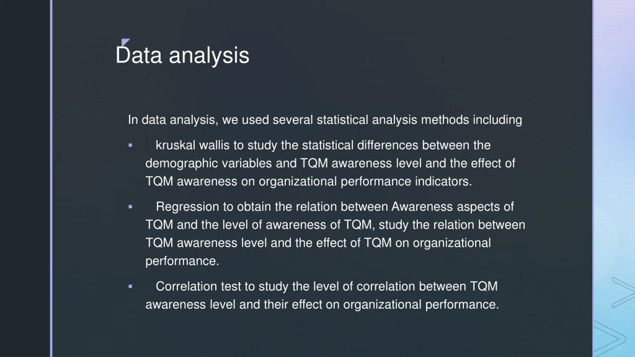 Data analysis In data analysis, we used several statistical analysis methods including kruskal wallis to study the statistical differences between the demographic variables and TQM awareness level and the effect of TQM awareness on organizational performance indicators. Regression to obtain the relation between Awareness aspects of TQM and the level of awareness of TQM, study the relation between TQM awareness level and the effect of TQM on organizational performance. Correlation test to study the level of correlation between TQM awareness level and their effect on organizational performance.