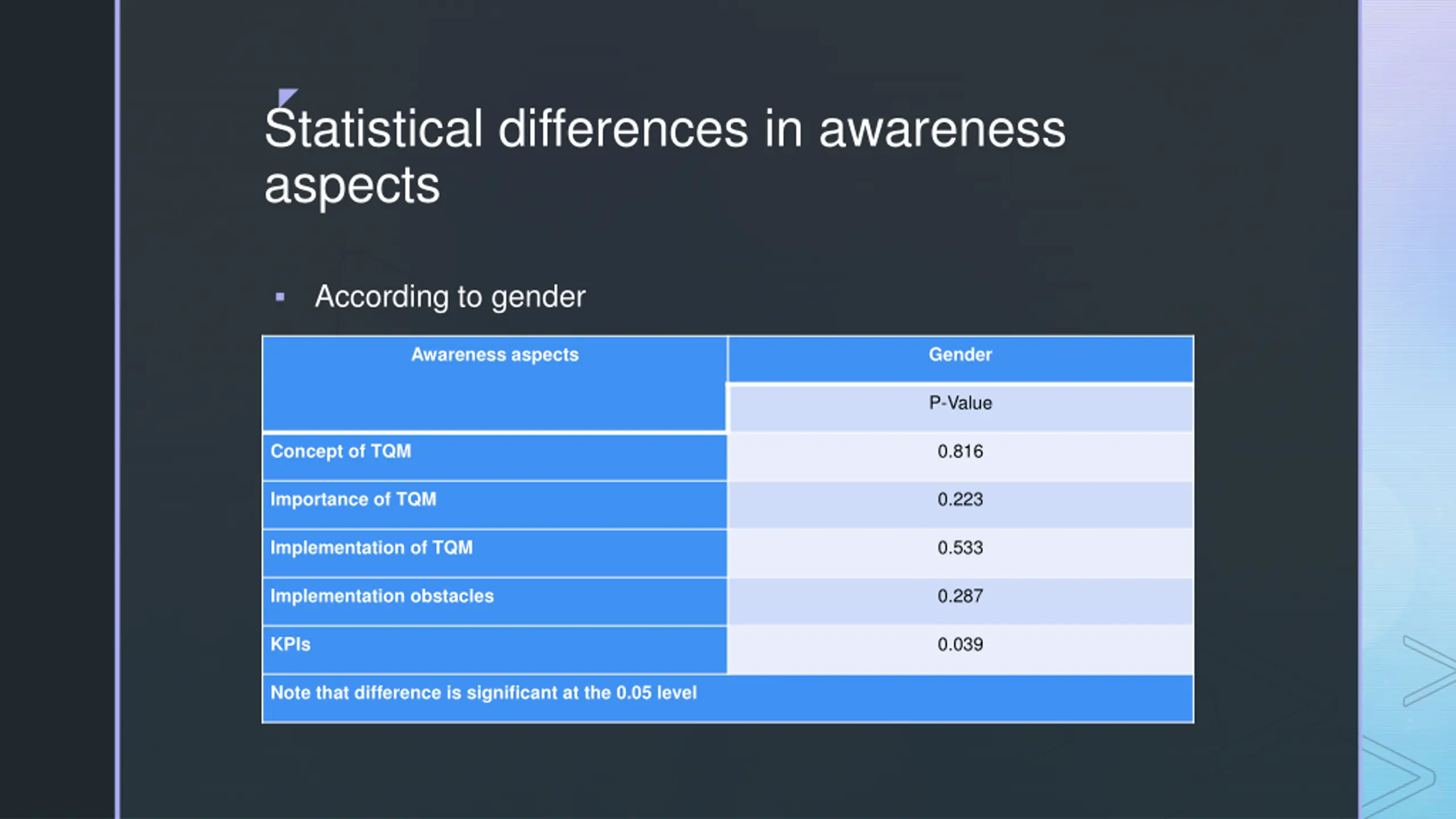 Statistical differences in awareness aspects According to gender Awareness aspects Gender P-Value 0.816 Concept of TQM 0.223 Importance of TQM 0.533 Implementation of TQM 0.287 Implementation obstacles 0.039 KPIs Note that difference is significant at the 0.05 level