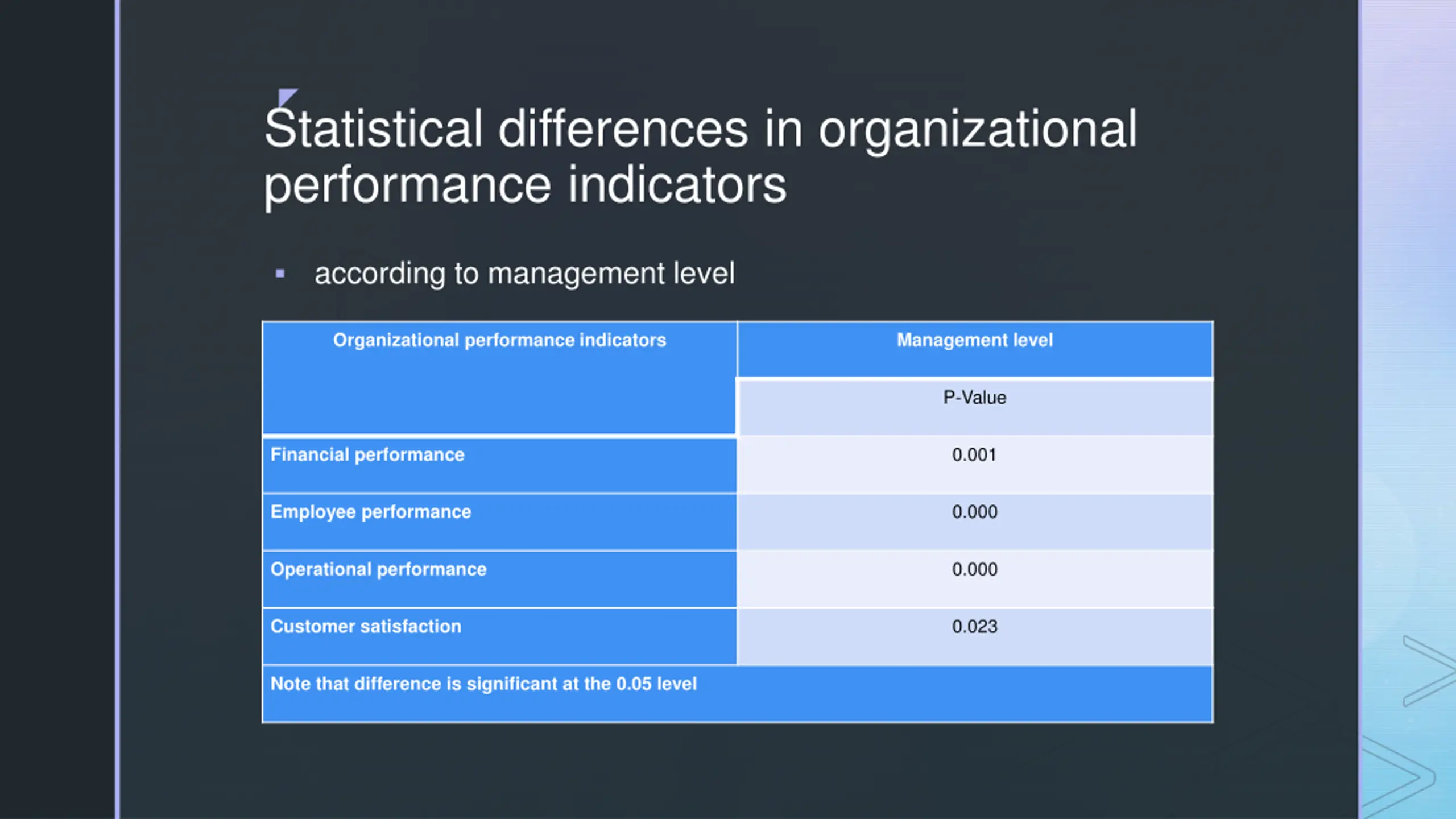Statistical differences in organizational performance indicators according to management level Organizational performance indicators Management level P-Value 0.001 Financial performance 0.000 Employee performance 0.000 Operational performance 0.023 Customer satisfaction Note that difference is significant at the 0.05 level