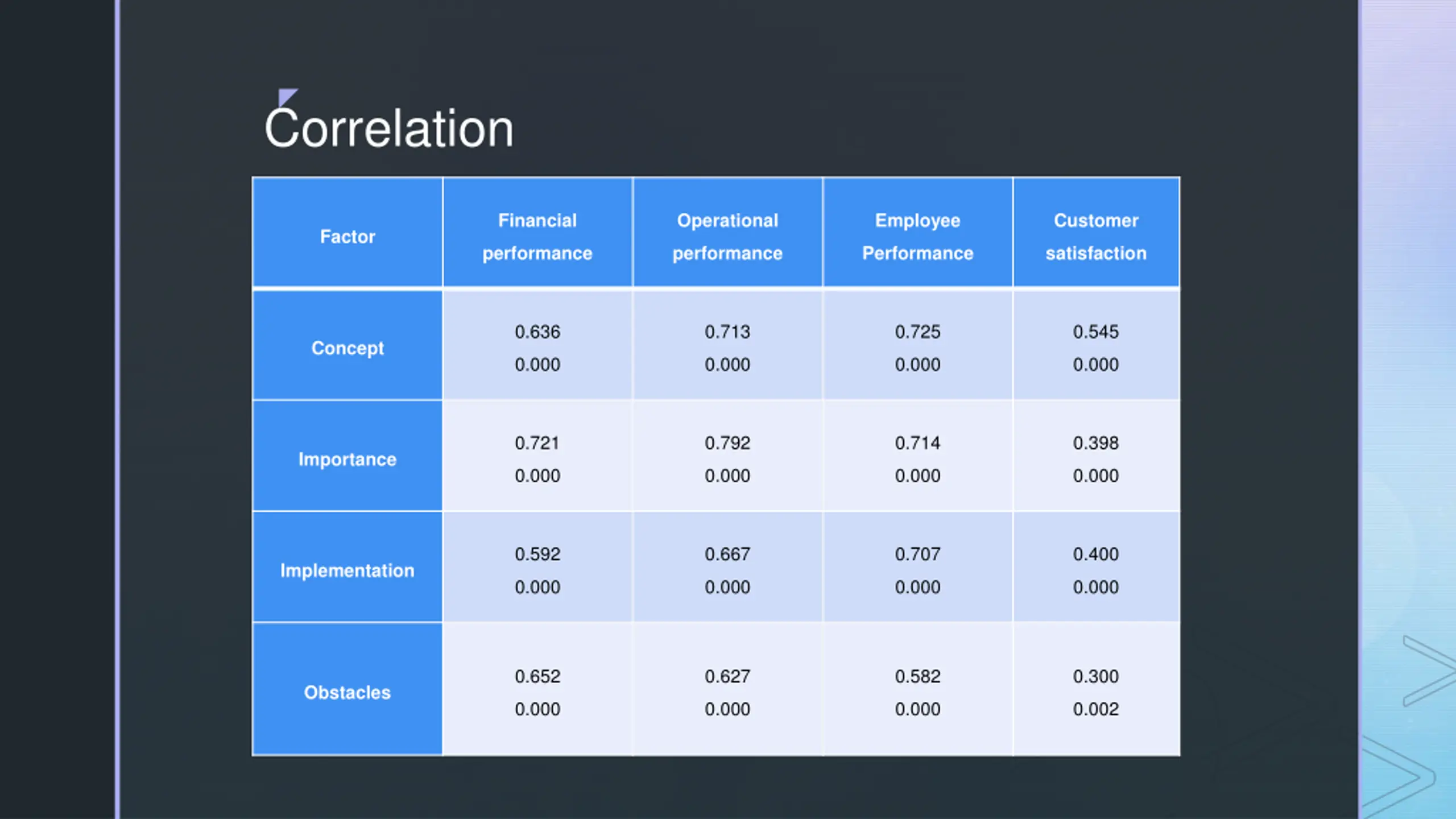 Correlation Financial Operational Employee Customer Factor performance performance Performance satisfaction 0.636 0.713 0.725 0.545 Concept 0.000 0.000 0.000 0.000 0.721 0.792 0.714 0.398 Importance 0.000 0.000 0.000 0.000 0.592 0.667 0.707 0.400 Implementation 0.000 0.000 0.000 0.000 0.652 0.627 0.582 0.300 Obstacles 0.000 0.000 0.000 0.002