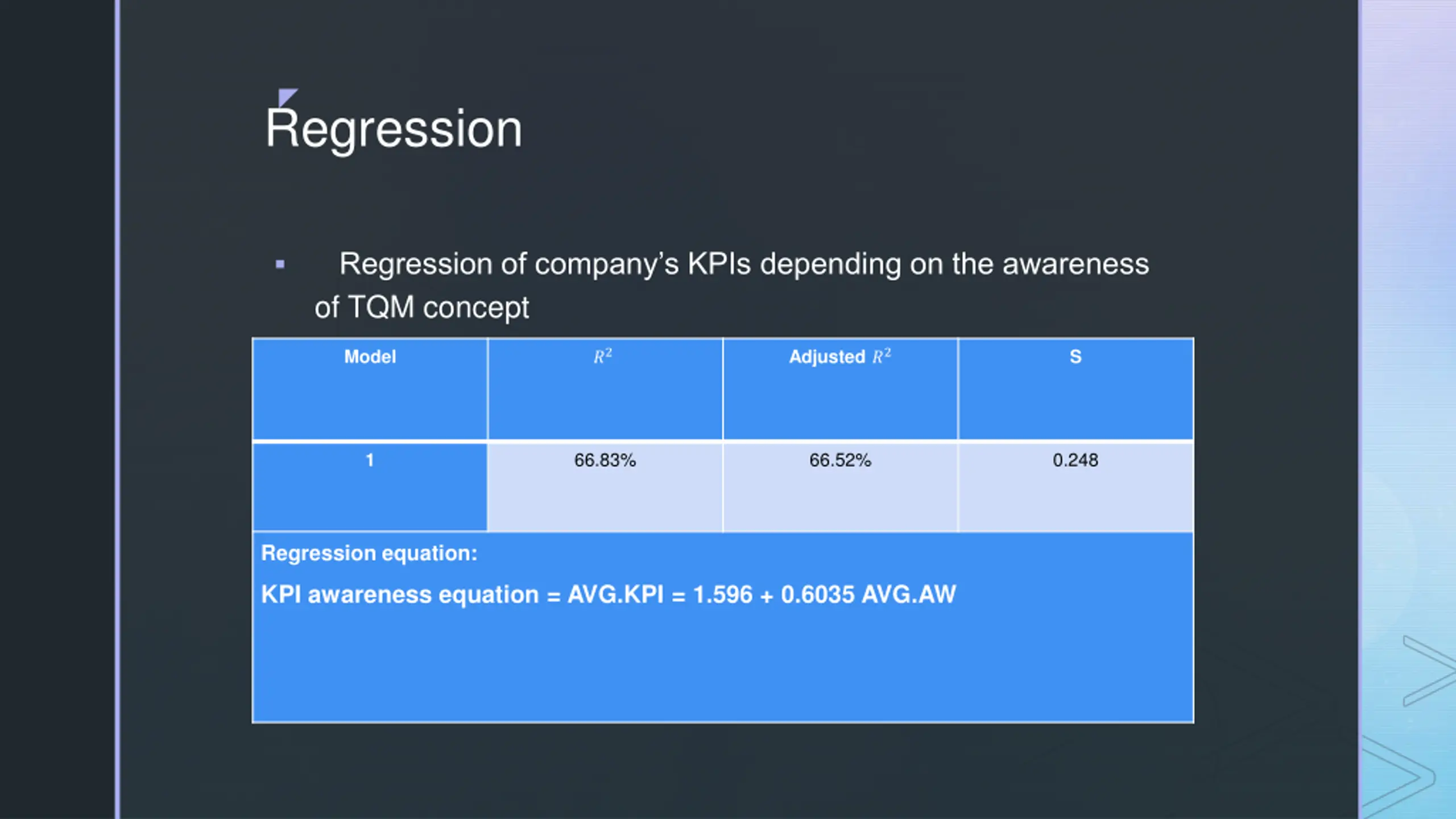 Regression Regression of company s KPIs depending on the awareness of TQM concept Model Adjusted ?2 S ?2 66.83% 66.52% 0.248 1 Regression equation: KPI awareness equation = AVG.KPI = 1.596 + 0.6035 AVG.AW