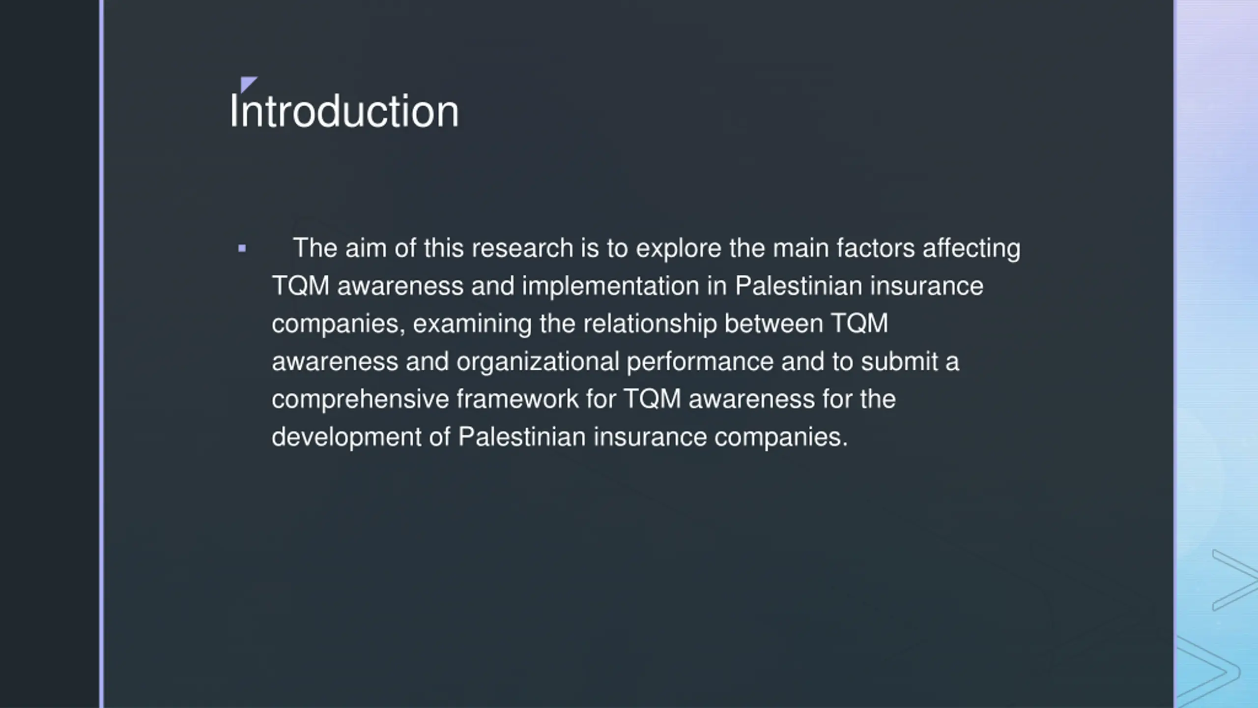 Introduction The aim of this research is to explore the main factors affecting TQM awareness and implementation in Palestinian insurance companies, examining the relationship between TQM awareness and organizational performance and to submit a comprehensive framework for TQM awareness for the development of Palestinian insurance companies.