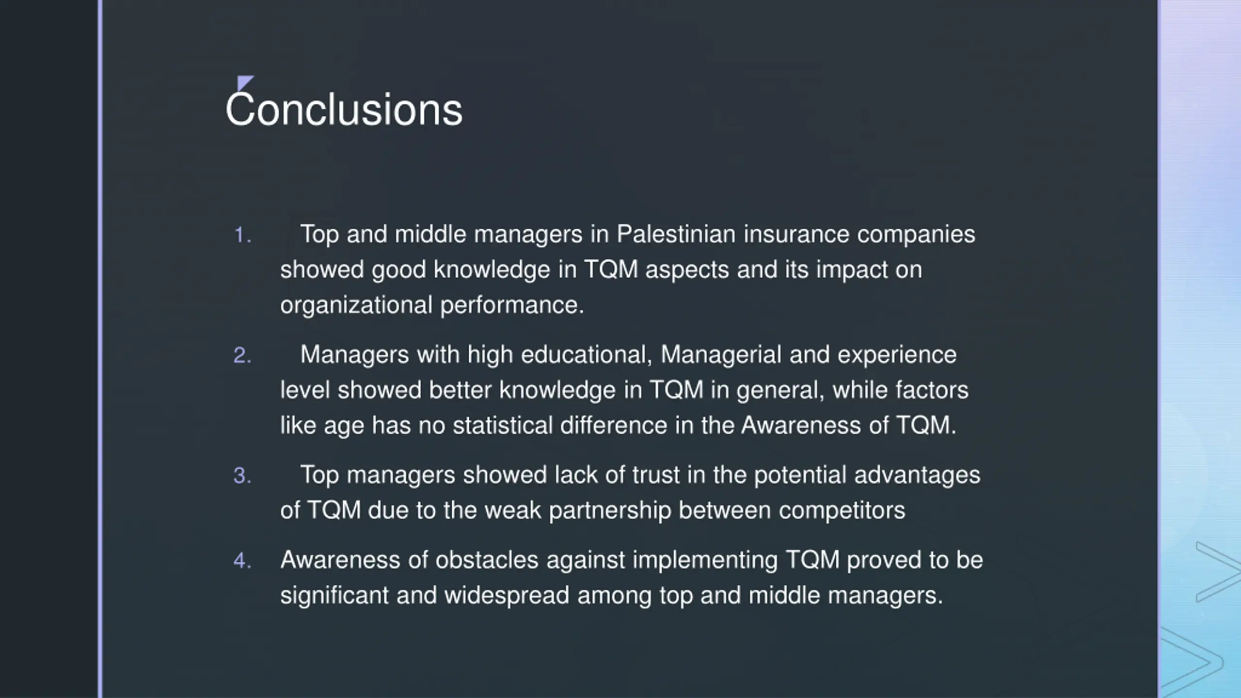 Conclusions Top and middle managers in Palestinian insurance companies showed good knowledge in TQM aspects and its impact on organizational performance. 1. Managers with high educational, Managerial and experience level showed better knowledge in TQM in general, while factors like age has no statistical difference in the Awareness of TQM. 2. Top managers showed lack of trust in the potential advantages of TQM due to the weak partnership between competitors 3. Awareness of obstacles against implementing TQM proved to be significant and widespread among top and middle managers. 4.