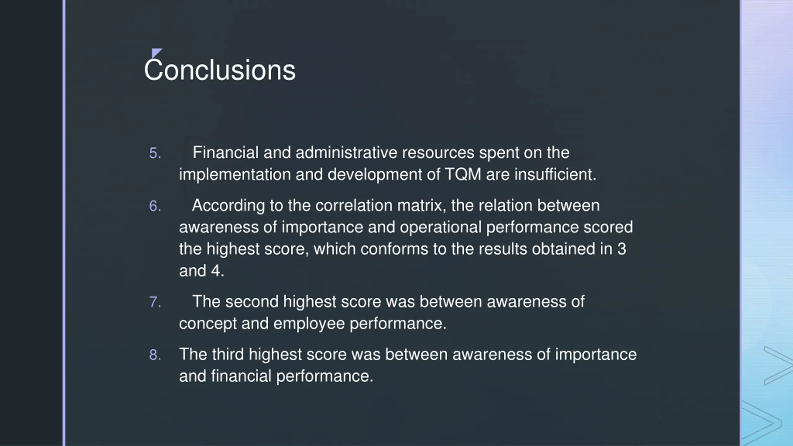 Conclusions Financial and administrative resources spent on the implementation and development of TQM are insufficient. 5. According to the correlation matrix, the relation between awareness of importance and operational performance scored the highest score, which conforms to the results obtained in 3 and 4. 6. The second highest score was between awareness of concept and employee performance. 7. The third highest score was between awareness of importance and financial performance. 8.