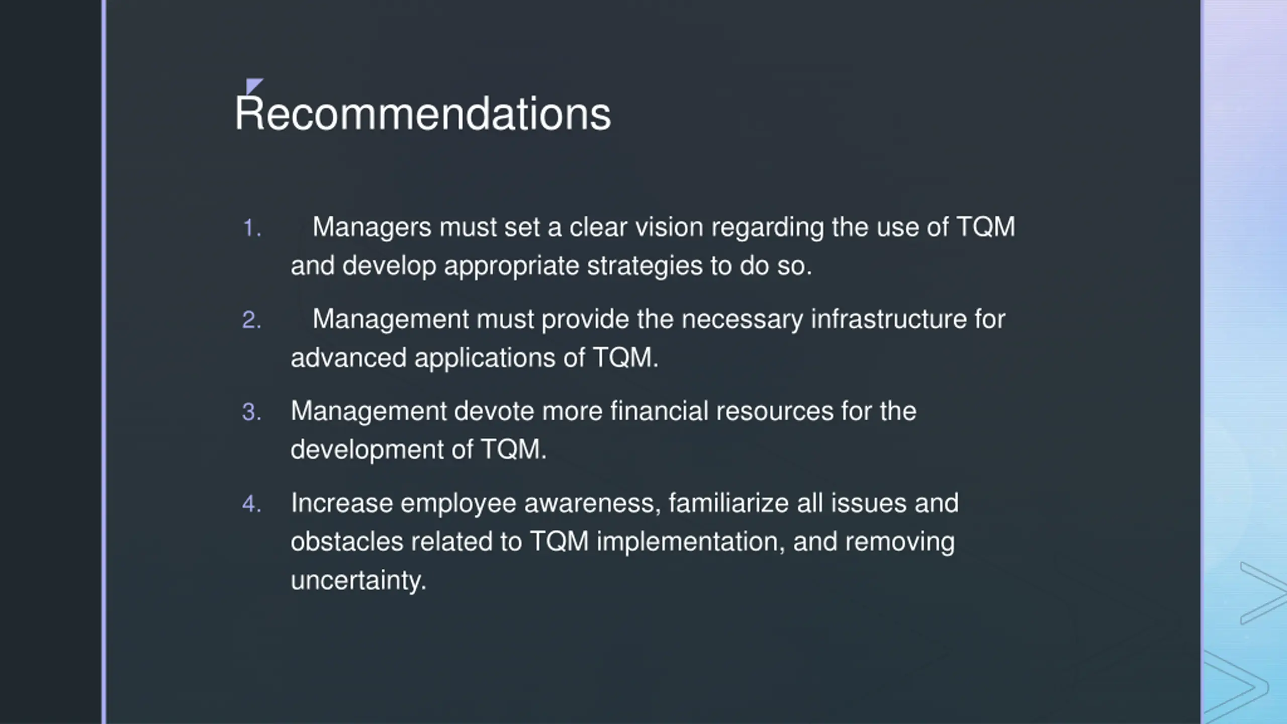 Recommendations Managers must set a clear vision regarding the use of TQM and develop appropriate strategies to do so. 1. Management must provide the necessary infrastructure for advanced applications of TQM. 2. Management devote more financial resources for the development of TQM. 3. Increase employee awareness, familiarize all issues and obstacles related to TQM implementation, and removing uncertainty. 4.