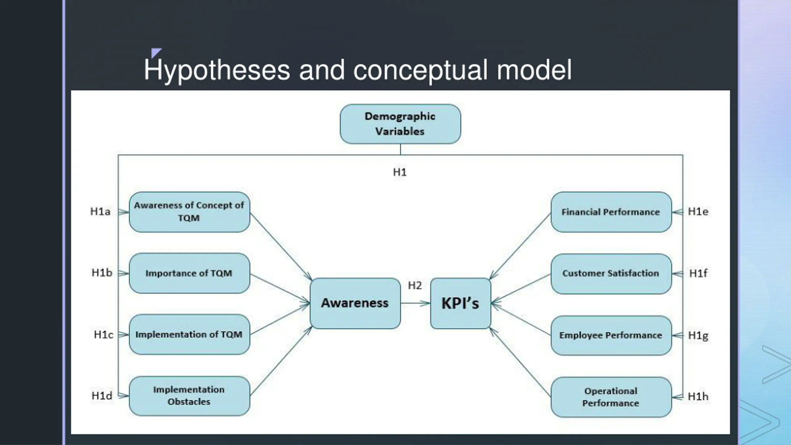 Research questions What is the level of awareness of top and middle management to the concept, importance, implementation techniques and implementation obstacles of TQM in the insurance sector. To what level does the difference in demographic characteristics affect the extent to which top and middle management understand the concept, importance, application and constraints of TQM in the insurance sector What is the impact of top and middle management awareness of TQM on the organizational performance