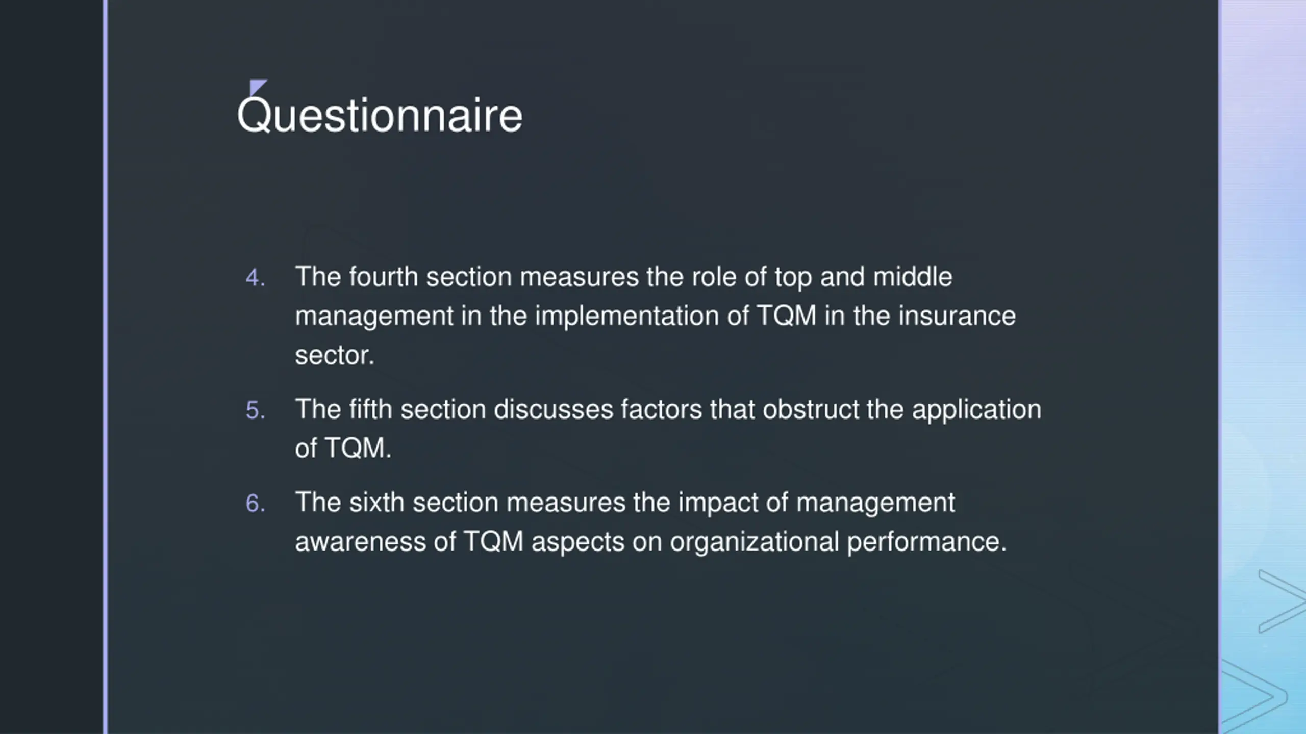 Questionnaire The fourth section measures the role of top and middle management in the implementation of TQM in the insurance sector. 4. The fifth section discusses factors that obstruct the application of TQM. 5. The sixth section measures the impact of management awareness of TQM aspects on organizational performance. 6.