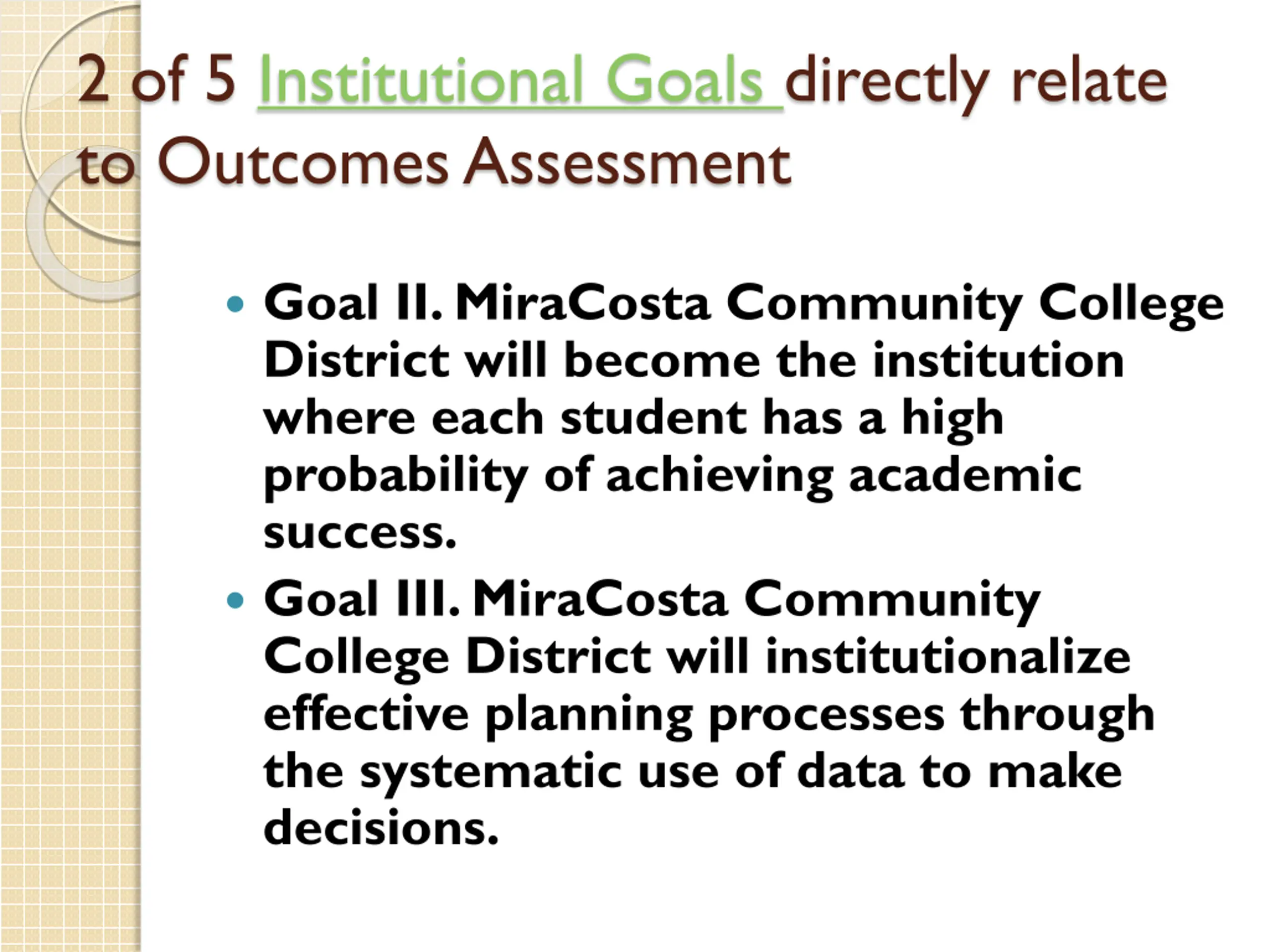 2 of 5 Institutional Goals directly relate to Outcomes Assessment Goal II. MiraCosta Community College District will become the institution where each student has a high probability of achieving academic success. Goal III. MiraCosta Community College District will institutionalize effective planning processes through the systematic use of data to make decisions.