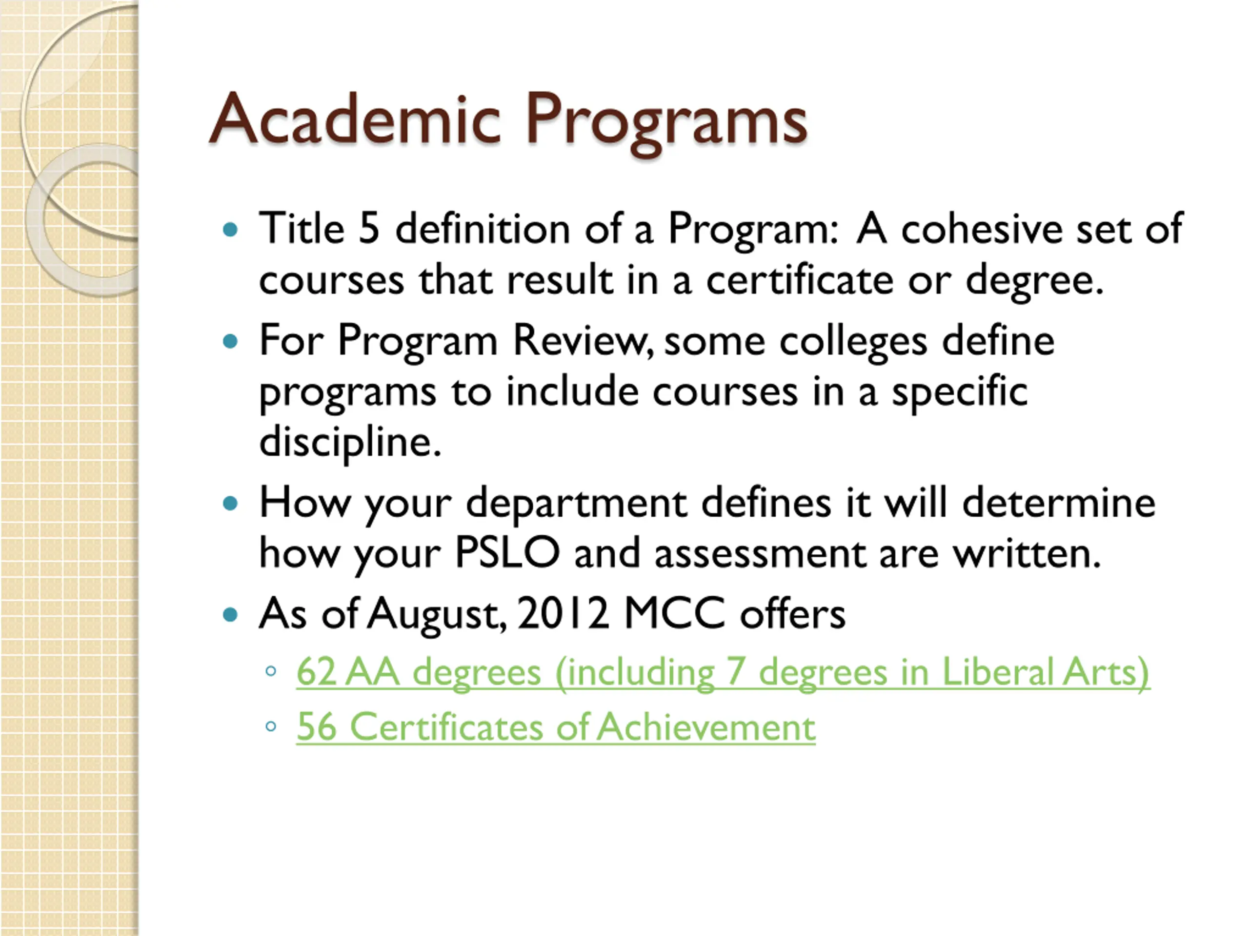Academic Programs Title 5 definition of a Program: A cohesive set of courses that result in a certificate or degree. For Program Review, some colleges define programs to include courses in a specific discipline. How your department defines it will determine how your PSLO and assessment are written. As of August, 2012 MCC offers 62 AA degrees (including 7 degrees in Liberal Arts) 56 Certificates of Achievement