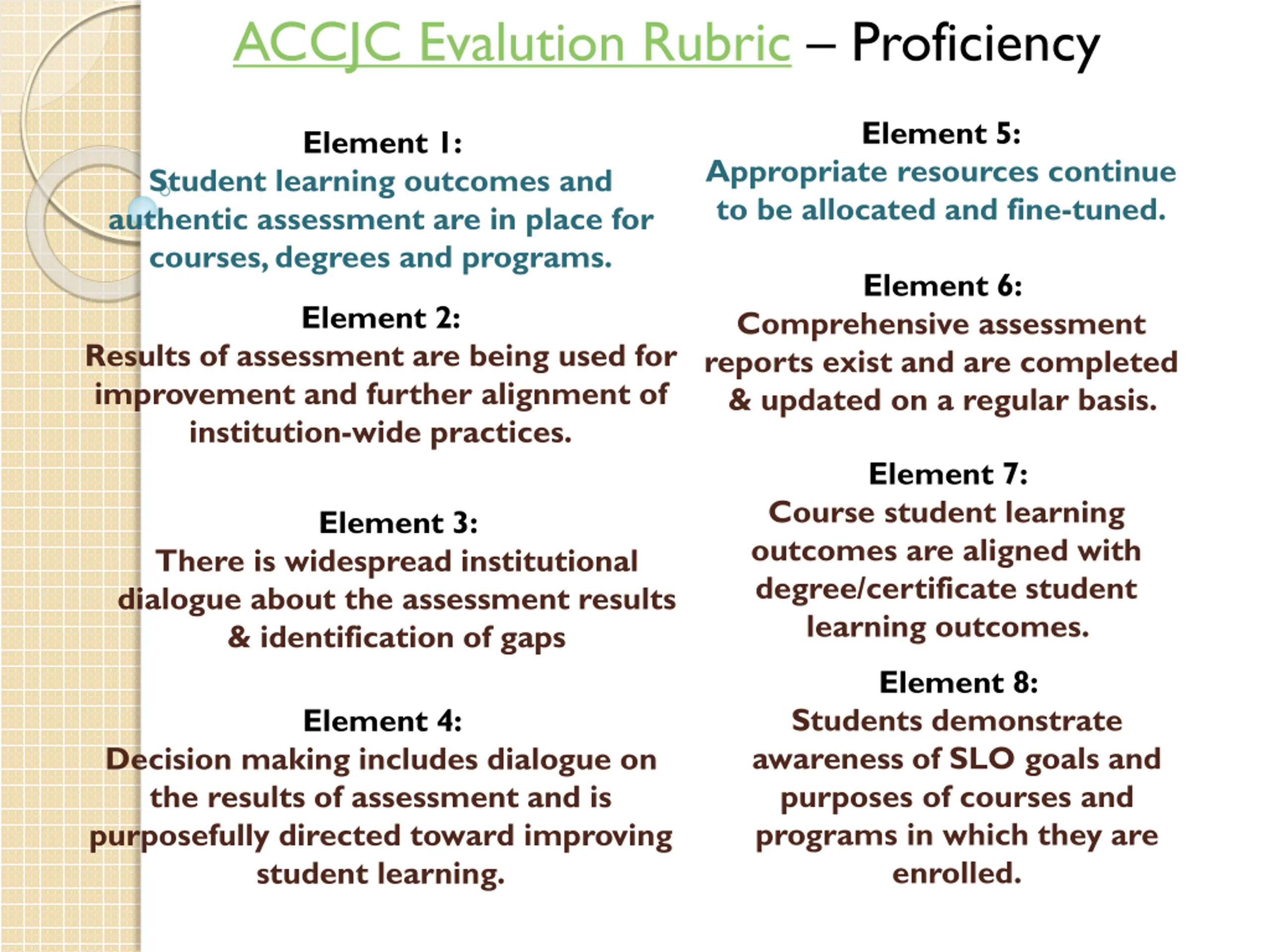ACCJC Evalution Rubric Proficiency Element 5: Element 1: Appropriate resources continue to be allocated and fine-tuned. Student learning outcomes and authentic assessment are in place for courses, degrees and programs. Element 6: Element 2: Comprehensive assessment reports exist and are completed & updated on a regular basis. Results of assessment are being used for improvement and further alignment of institution-wide practices. Element 7: Course student learning outcomes are aligned with degree/certificate student learning outcomes. Element 3: There is widespread institutional dialogue about the assessment results & identification of gaps Element 8: Students demonstrate awareness of SLO goals and purposes of courses and programs in which they are enrolled. Element 4: Decision making includes dialogue on the results of assessment and is purposefully directed toward improving student learning.