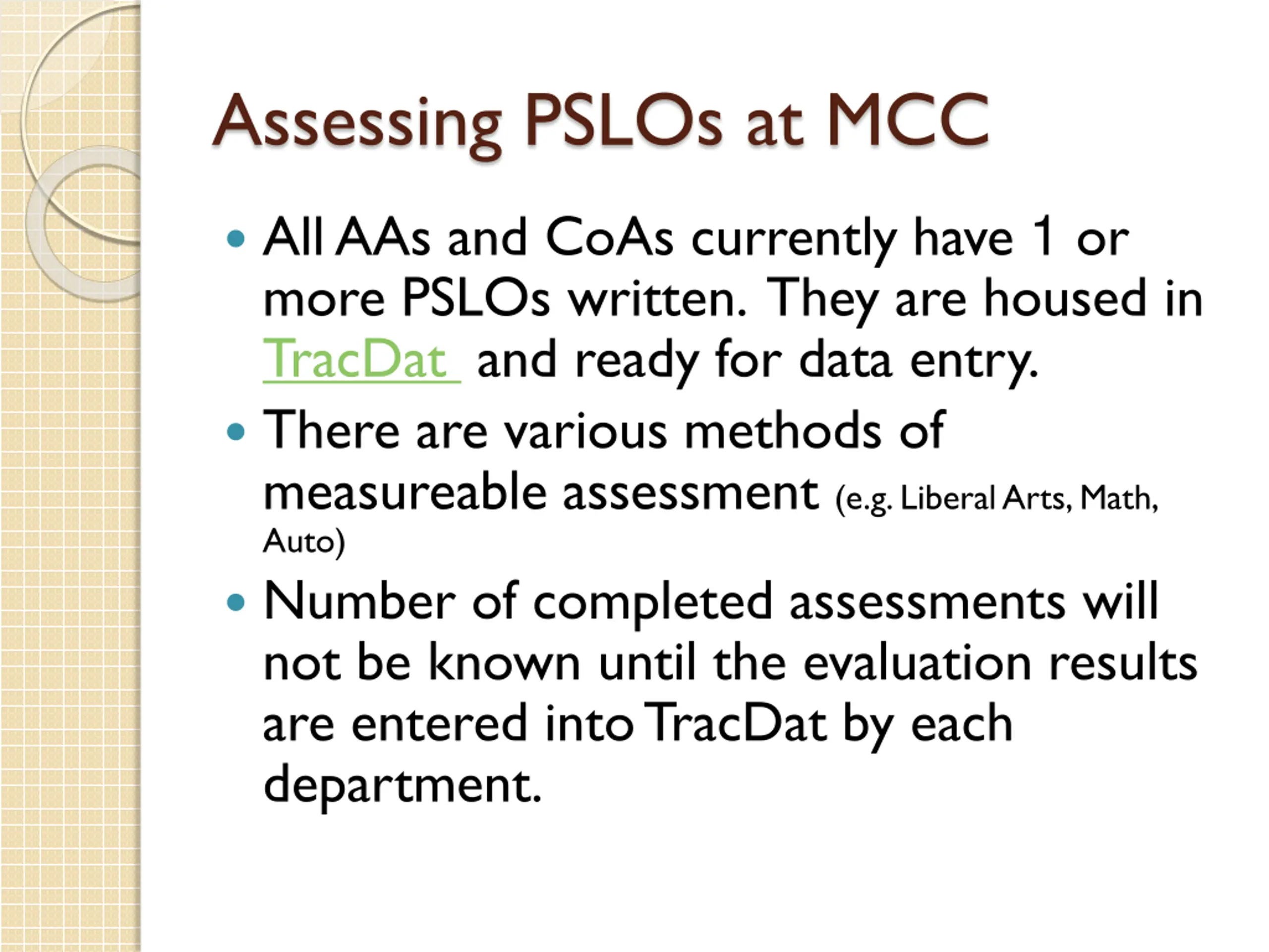 Assessing PSLOs at MCC All AAs and CoAs currently have 1 or more PSLOs written. They are housed in TracDat and ready for data entry. There are various methods of measureable assessment (e.g. Liberal Arts, Math, Auto) Number of completed assessments will not be known until the evaluation results are entered into TracDat by each department.