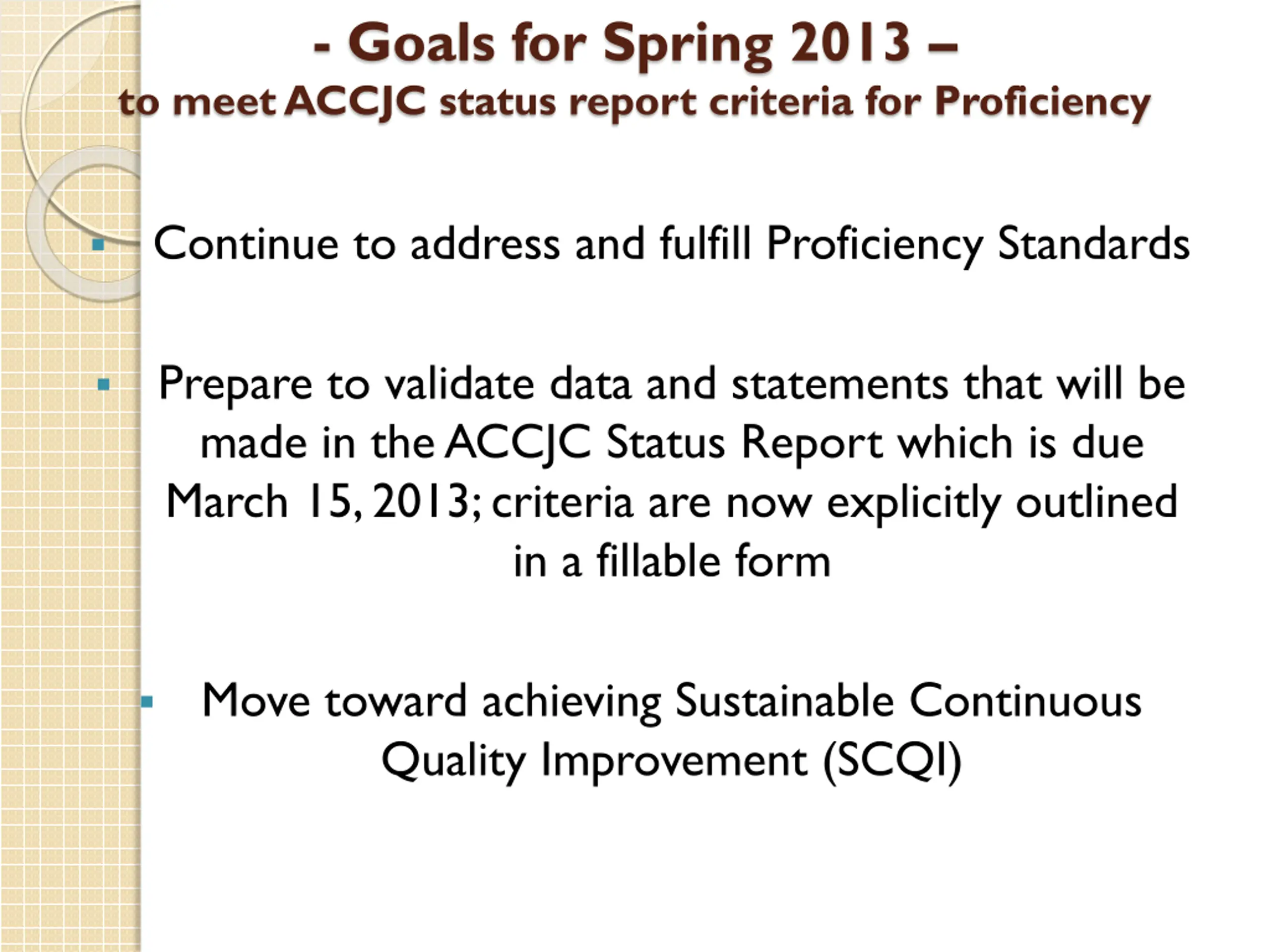 - Goals for Spring 2013 to meet ACCJC status report criteria for Proficiency Continue to address and fulfill Proficiency Standards Prepare to validate data and statements that will be made in the ACCJC Status Report which is due March 15, 2013; criteria are now explicitly outlined in a fillable form Move toward achieving Sustainable Continuous Quality Improvement (SCQI)