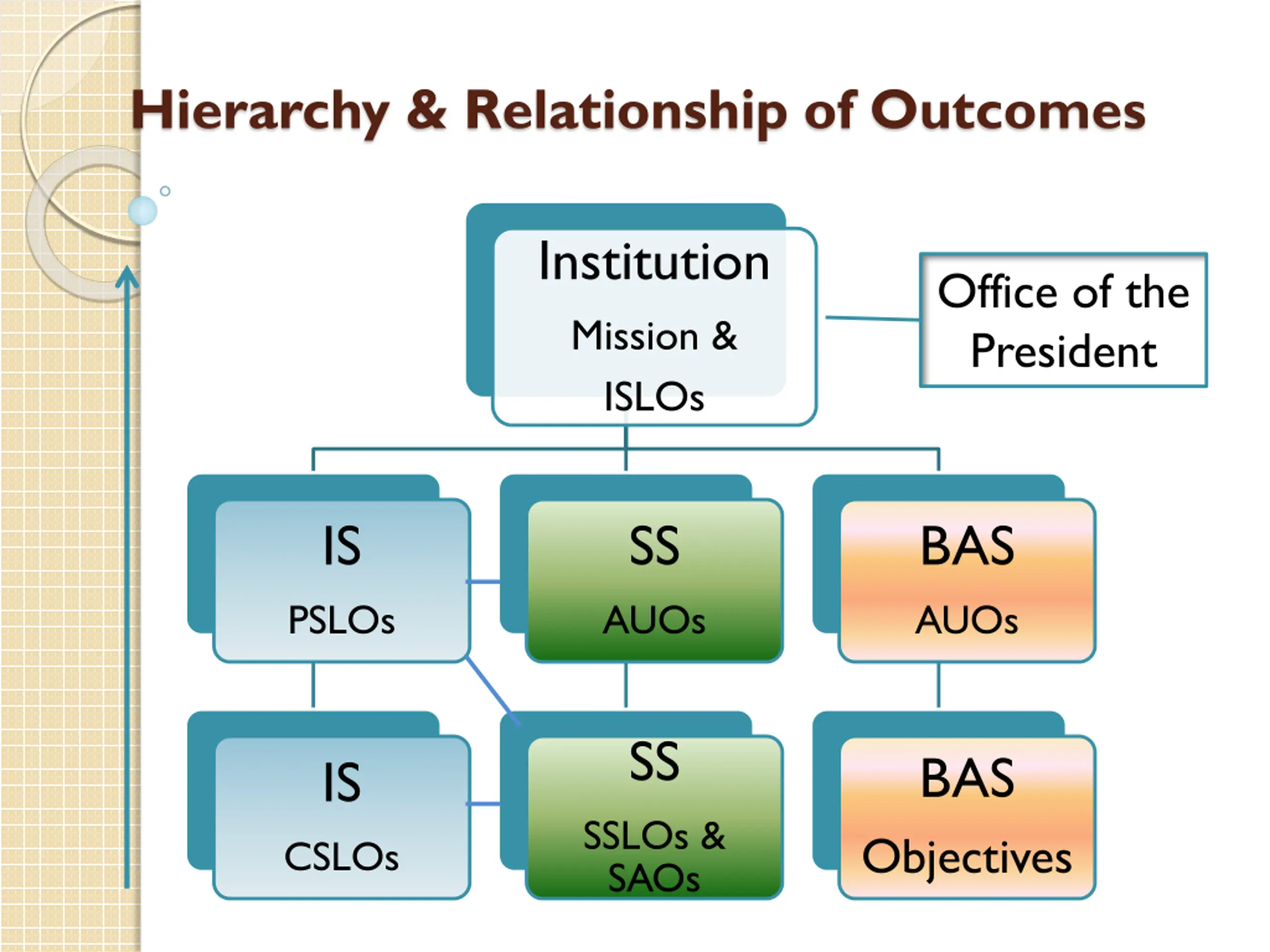 Hierarchy & Relationship of Outcomes Institution Mission & ISLOs Office of the President IS SS BAS AUOs PSLOs AUOs SS BAS IS SSLOs & SAOs Objectives CSLOs