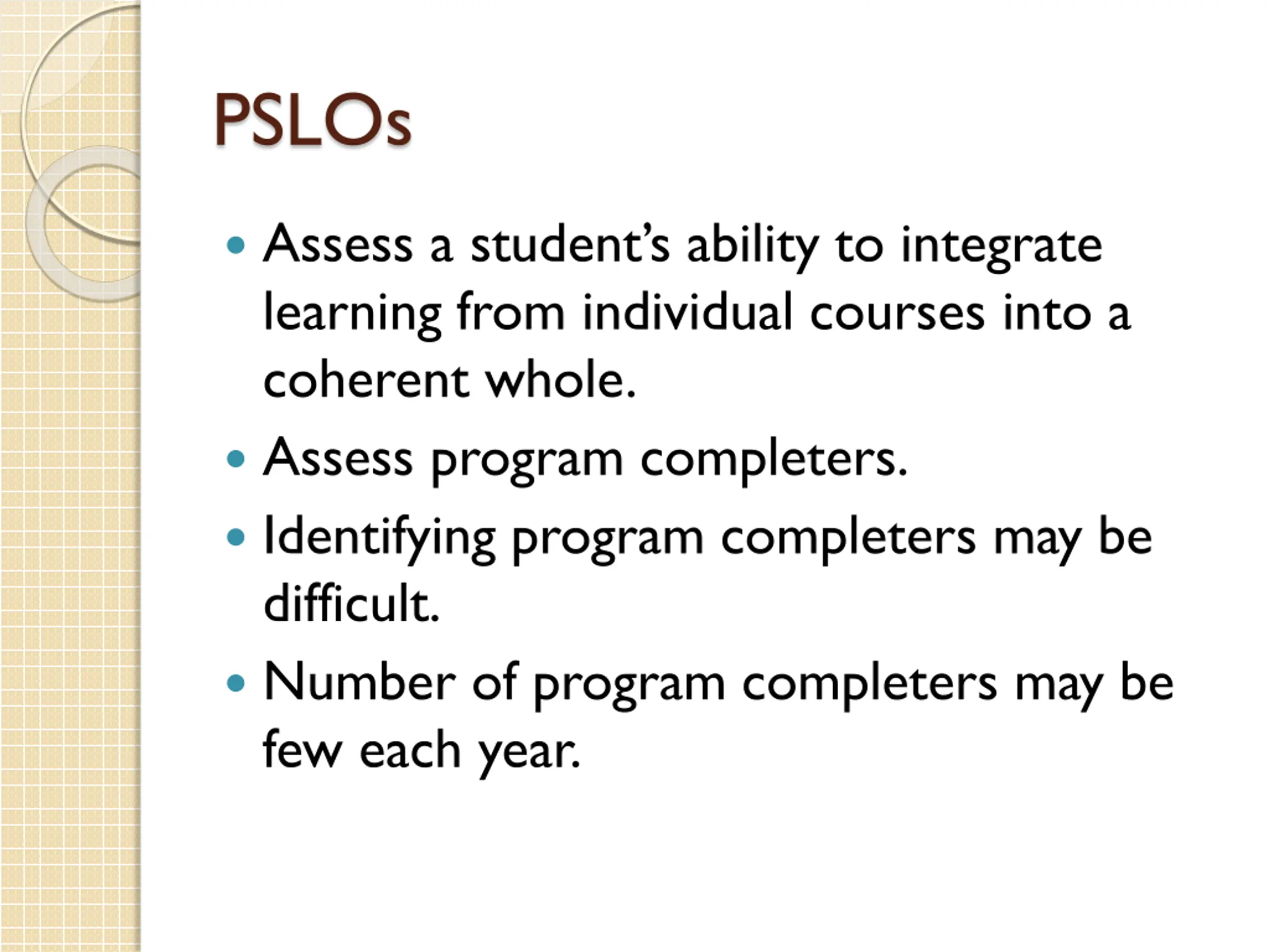 PSLOs Assess a student s ability to integrate learning from individual courses into a coherent whole. Assess program completers. Identifying program completers may be difficult. Number of program completers may be few each year.