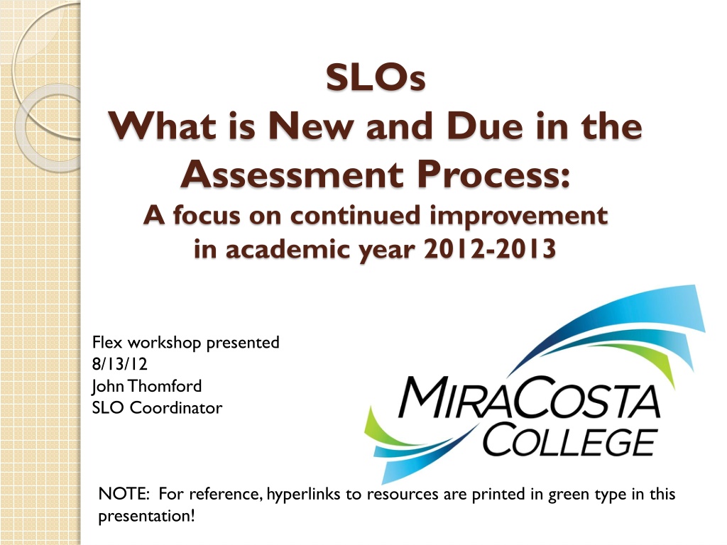 SLOs What is New and Due in the Assessment Process: A focus on continued improvement in academic year 2012-2013 Flex workshop presented 8/13/12 John Thomford SLO Coordinator NOTE: For reference, hyperlinks to resources are printed in green type in this presentation!