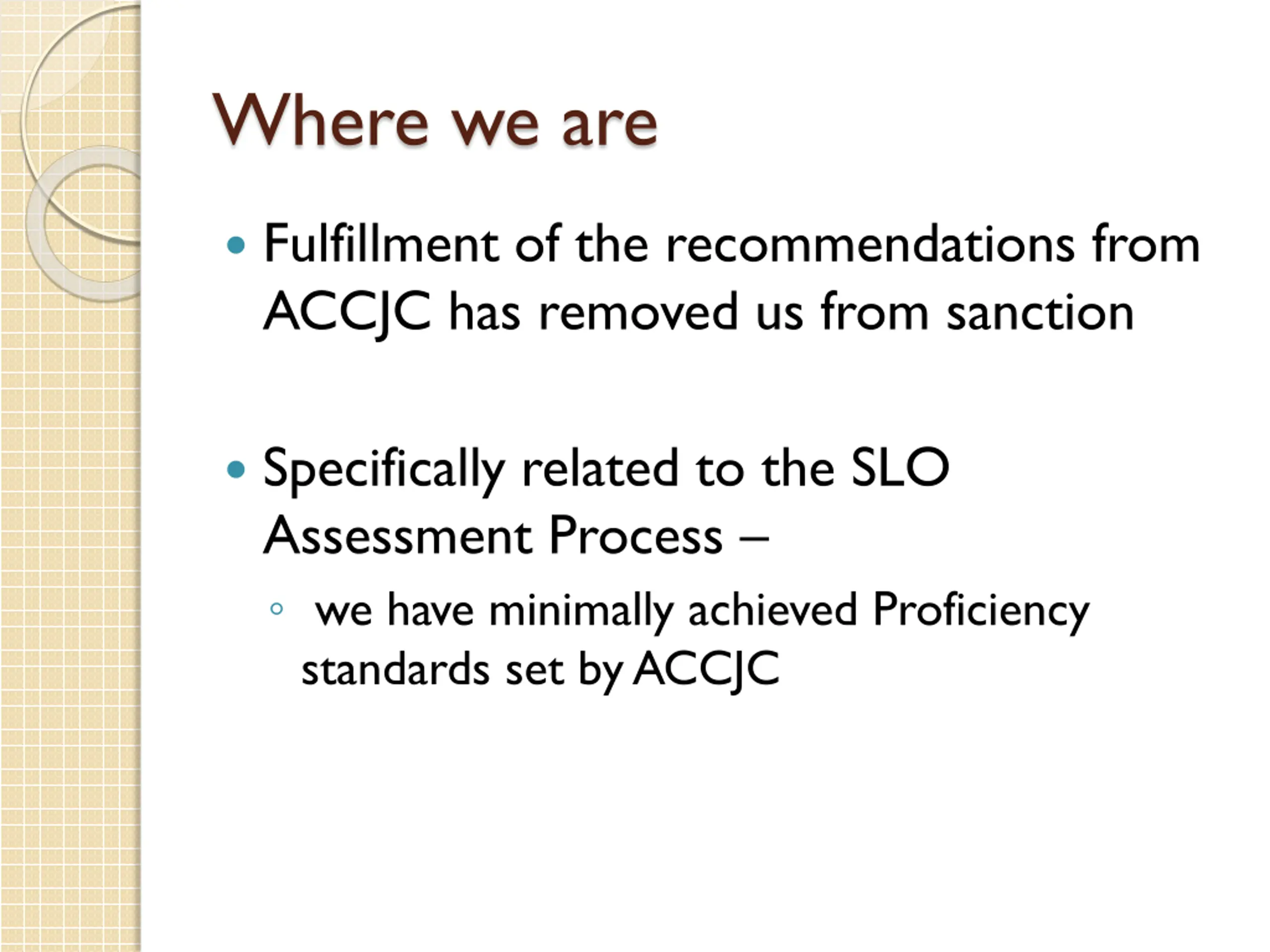 Where we are Fulfillment of the recommendations from ACCJC has removed us from sanction Specifically related to the SLO Assessment Process we have minimally achieved Proficiency standards set by ACCJC