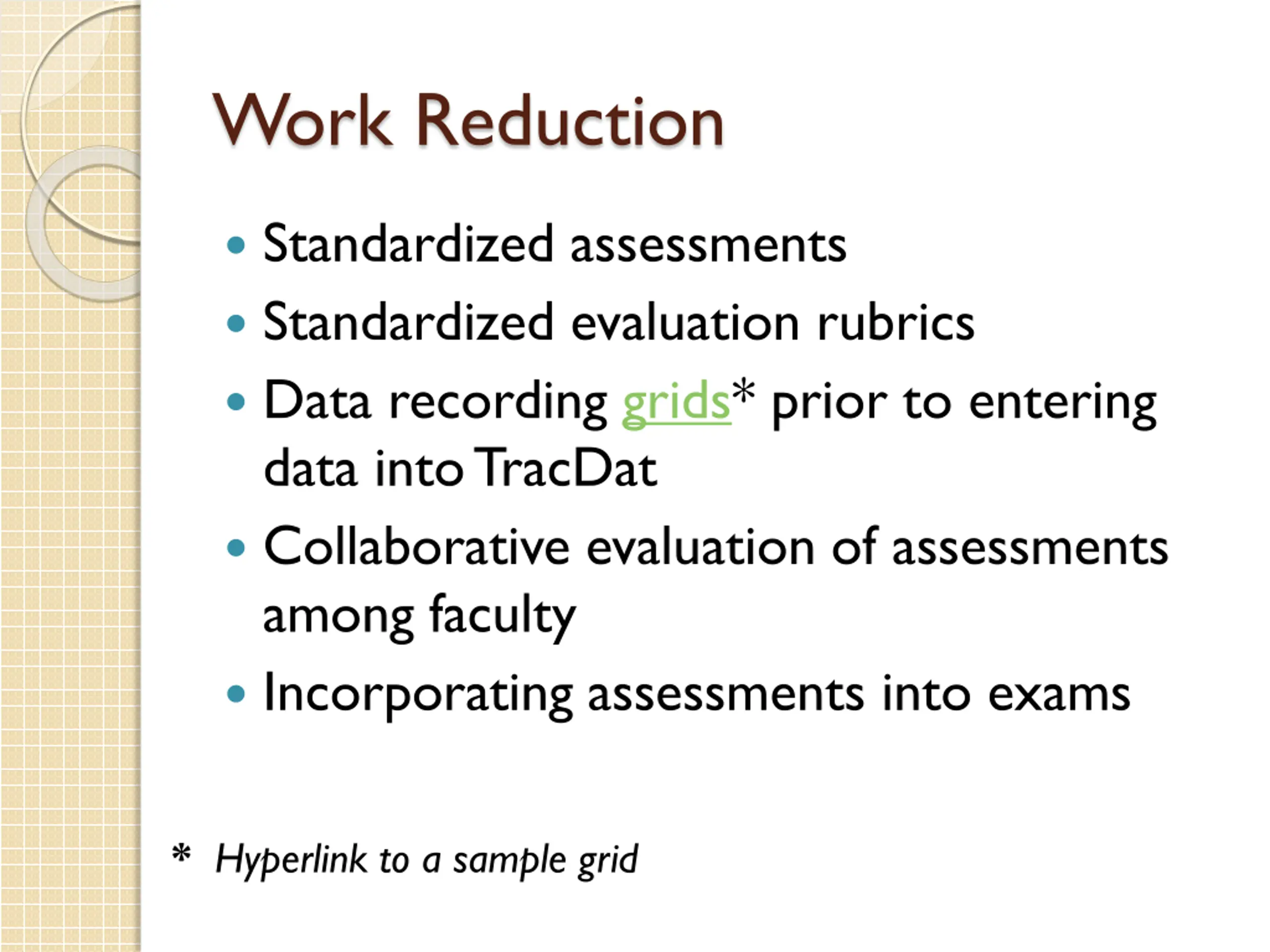 Work Reduction Standardized assessments Standardized evaluation rubrics Data recording grids* prior to entering data into TracDat Collaborative evaluation of assessments among faculty Incorporating assessments into exams *Hyperlink to a sample grid