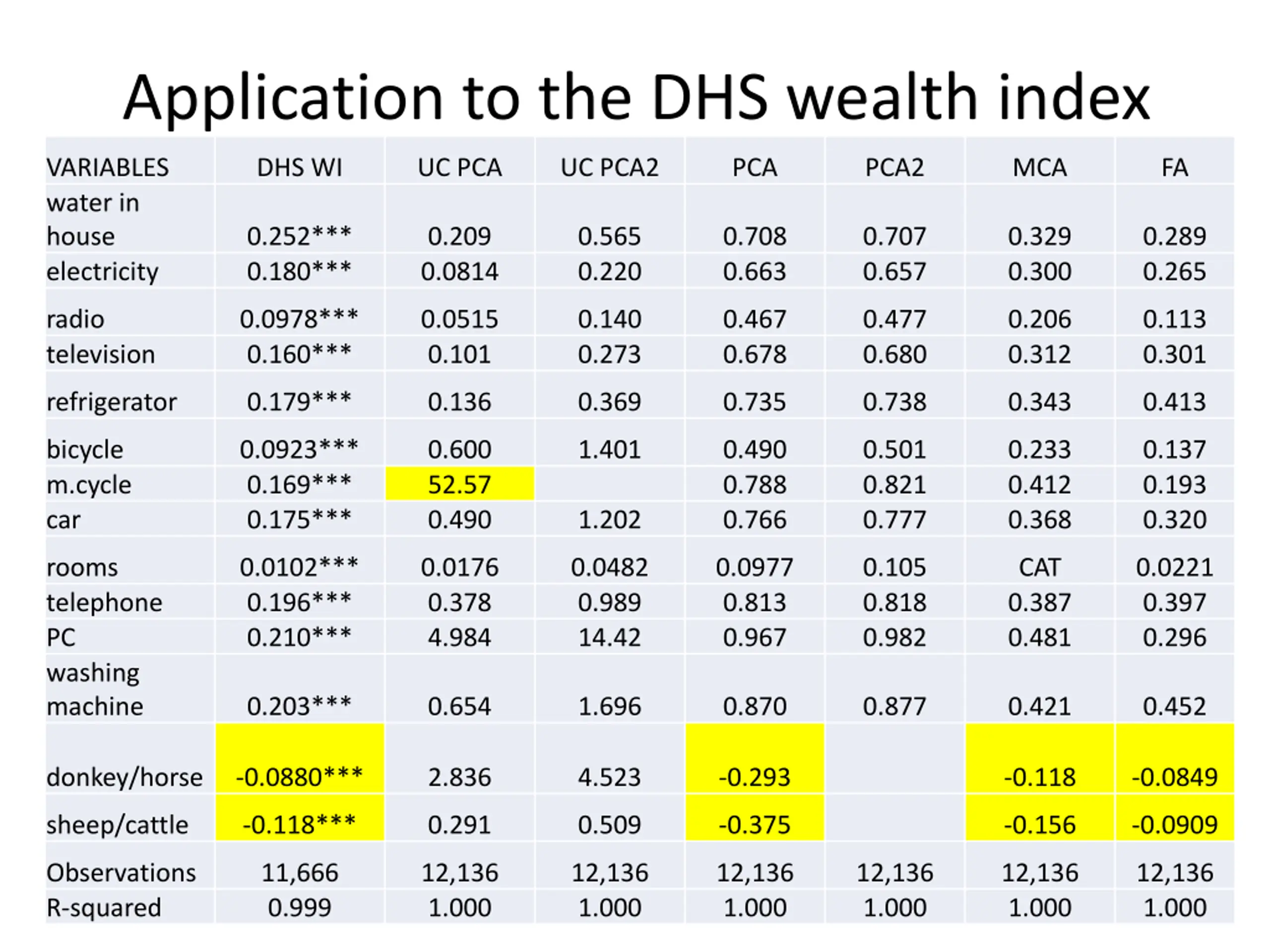 Application to the DHS wealth index VARIABLES water in house electricity DHS WI UC PCA UC PCA2 PCA PCA2 MCA FA 0.252*** 0.180*** 0.209 0.0814 0.565 0.220 0.708 0.663 0.707 0.657 0.329 0.300 0.289 0.265 radio television 0.0978*** 0.160*** 0.0515 0.101 0.140 0.273 0.467 0.678 0.477 0.680 0.206 0.312 0.113 0.301 refrigerator 0.179*** 0.136 0.369 0.735 0.738 0.343 0.413 bicycle m.cycle car 0.0923*** 0.169*** 0.175*** 0.600 52.57 0.490 1.401 0.490 0.788 0.766 0.501 0.821 0.777 0.233 0.412 0.368 0.137 0.193 0.320 1.202 rooms telephone PC washing machine 0.0102*** 0.196*** 0.210*** 0.0176 0.378 4.984 0.0482 0.989 14.42 0.0977 0.813 0.967 0.105 0.818 0.982 CAT 0.387 0.481 0.0221 0.397 0.296 0.203*** 0.654 1.696 0.870 0.877 0.421 0.452 donkey/horse -0.0880*** 2.836 4.523 -0.293 -0.118 -0.0849 sheep/cattle -0.118*** 0.291 0.509 -0.375 -0.156 -0.0909 Observations R-squared 11,666 0.999 12,136 1.000 12,136 1.000 12,136 1.000 12,136 1.000 12,136 1.000 12,136 1.000