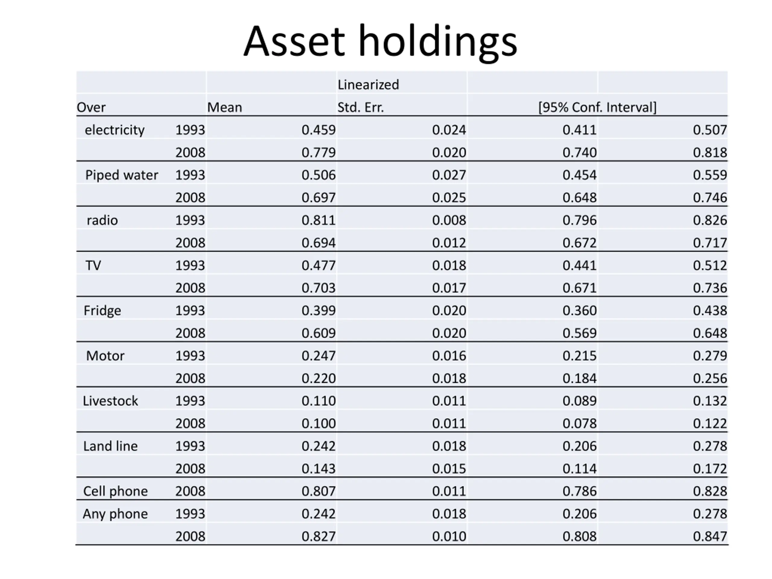 Asset holdings Linearized Over Mean Std. Err. [95% Conf. Interval] electricity 1993 2008 0.459 0.779 0.024 0.020 0.411 0.740 0.507 0.818 Piped water 1993 0.506 0.027 0.454 0.559 2008 0.697 0.811 0.025 0.008 0.648 0.796 0.746 0.826 radio 1993 2008 0.694 0.012 0.672 0.717 TV 1993 0.477 0.703 0.018 0.017 0.441 0.671 0.512 0.736 2008 Fridge 1993 0.399 0.020 0.360 0.438 2008 1993 0.609 0.247 0.020 0.016 0.569 0.215 0.648 0.279 Motor 2008 0.220 0.018 0.184 0.256 Livestock 1993 0.110 0.100 0.011 0.011 0.089 0.078 0.132 0.122 2008 Land line 1993 0.242 0.018 0.206 0.278 2008 0.143 0.807 0.015 0.011 0.114 0.786 0.172 0.828 Cell phone 2008 Any phone 1993 0.242 0.827 0.018 0.010 0.206 0.808 0.278 0.847 2008