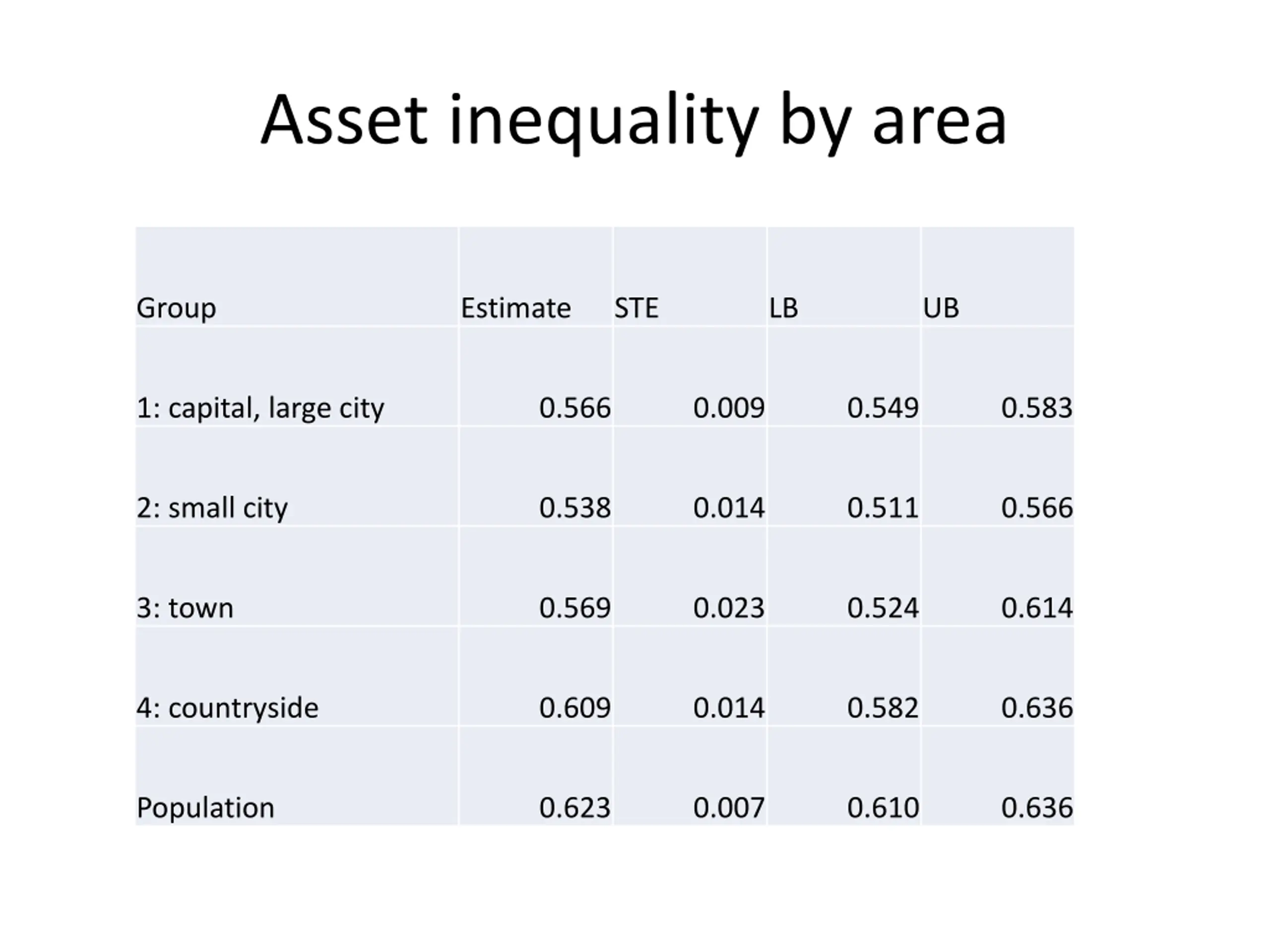 Asset inequality by area Group Estimate STE LB UB 1: capital, large city 0.566 0.009 0.549 0.583 2: small city 0.538 0.014 0.511 0.566 3: town 0.569 0.023 0.524 0.614 4: countryside 0.609 0.014 0.582 0.636 Population 0.623 0.007 0.610 0.636