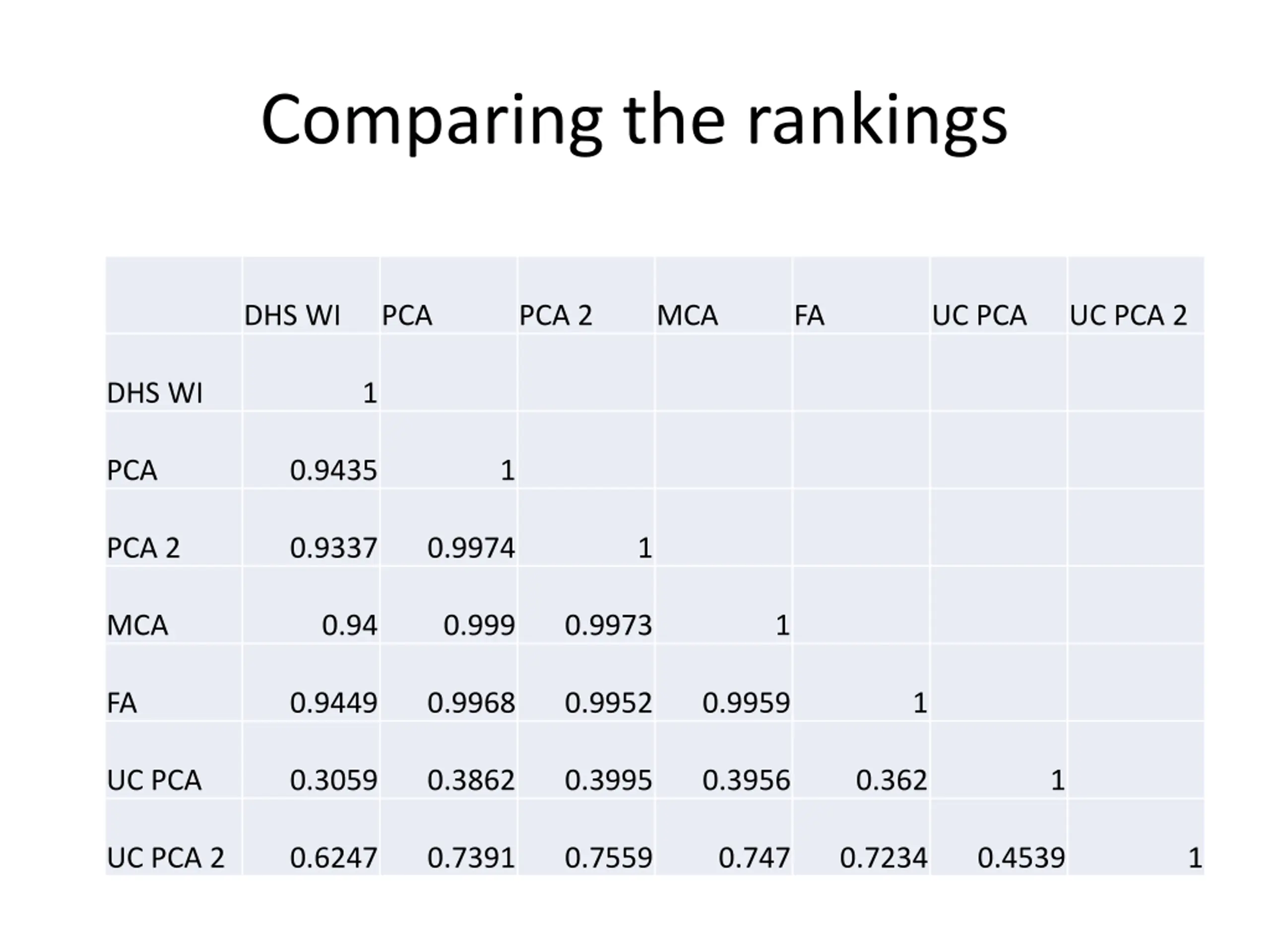 Comparing the rankings DHS WI PCA PCA 2 MCA FA UC PCA UC PCA 2 DHS WI 1 PCA 0.9435 1 PCA 2 0.9337 0.9974 1 MCA 0.94 0.999 0.9973 1 FA 0.9449 0.9968 0.9952 0.9959 1 UC PCA 0.3059 0.3862 0.3995 0.3956 0.362 1 UC PCA 2 0.6247 0.7391 0.7559 0.747 0.7234 0.4539 1