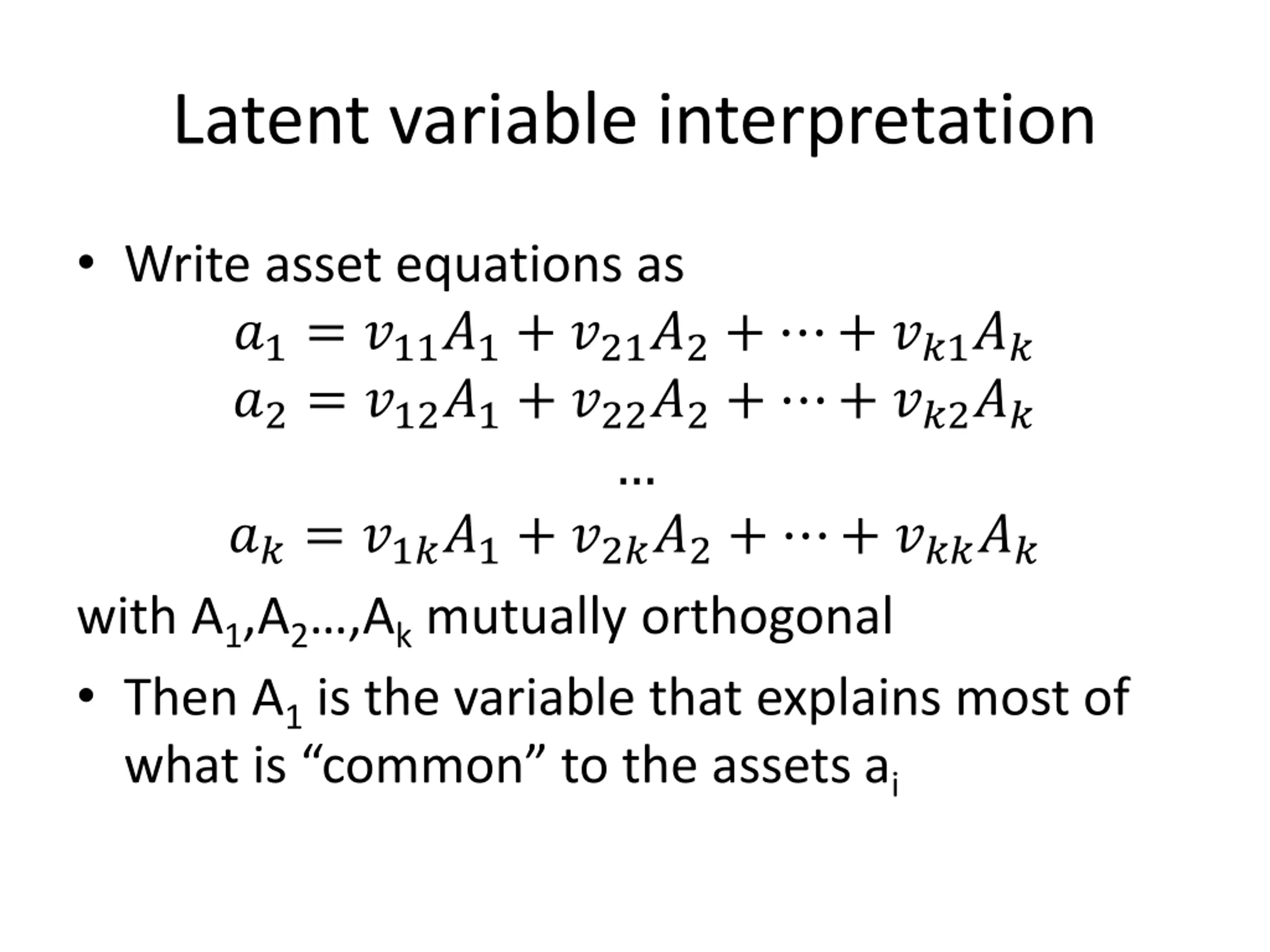 Latent variable interpretation Write asset equations as ?1= ?11?1+ ?21?2+ + ??1?? ?2= ?12?1+ ?22?2+ + ??2?? ??= ?1??1+ ?2??2+ + ????? with A1,A2 ,Akmutually orthogonal Then A1is the variable that explains most of what is common to the assets ai