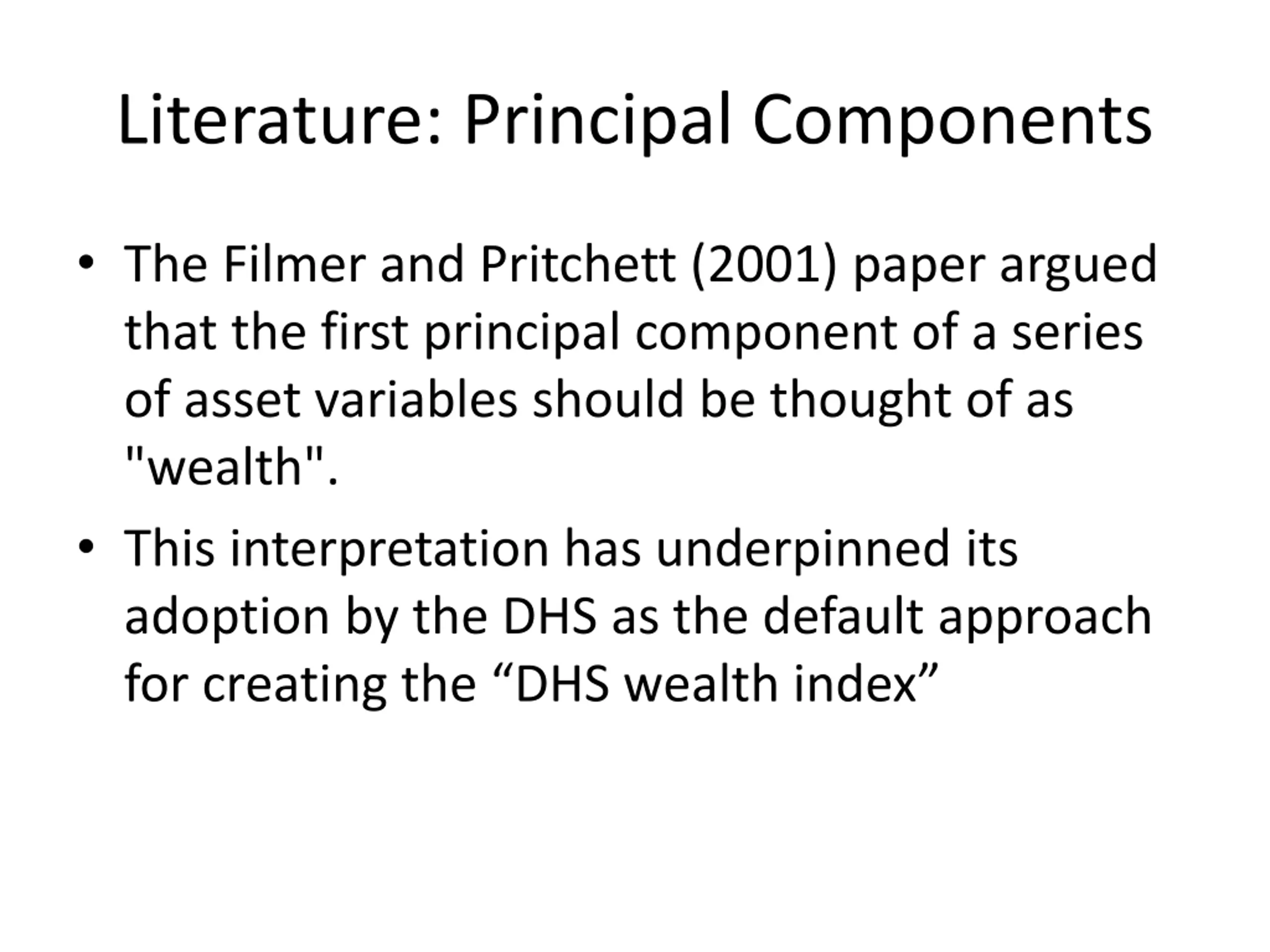 Literature: Principal Components The Filmer and Pritchett (2001) paper argued that the first principal component of a series of asset variables should be thought of as "wealth". This interpretation has underpinned its adoption by the DHS as the default approach for creating the DHS wealth index