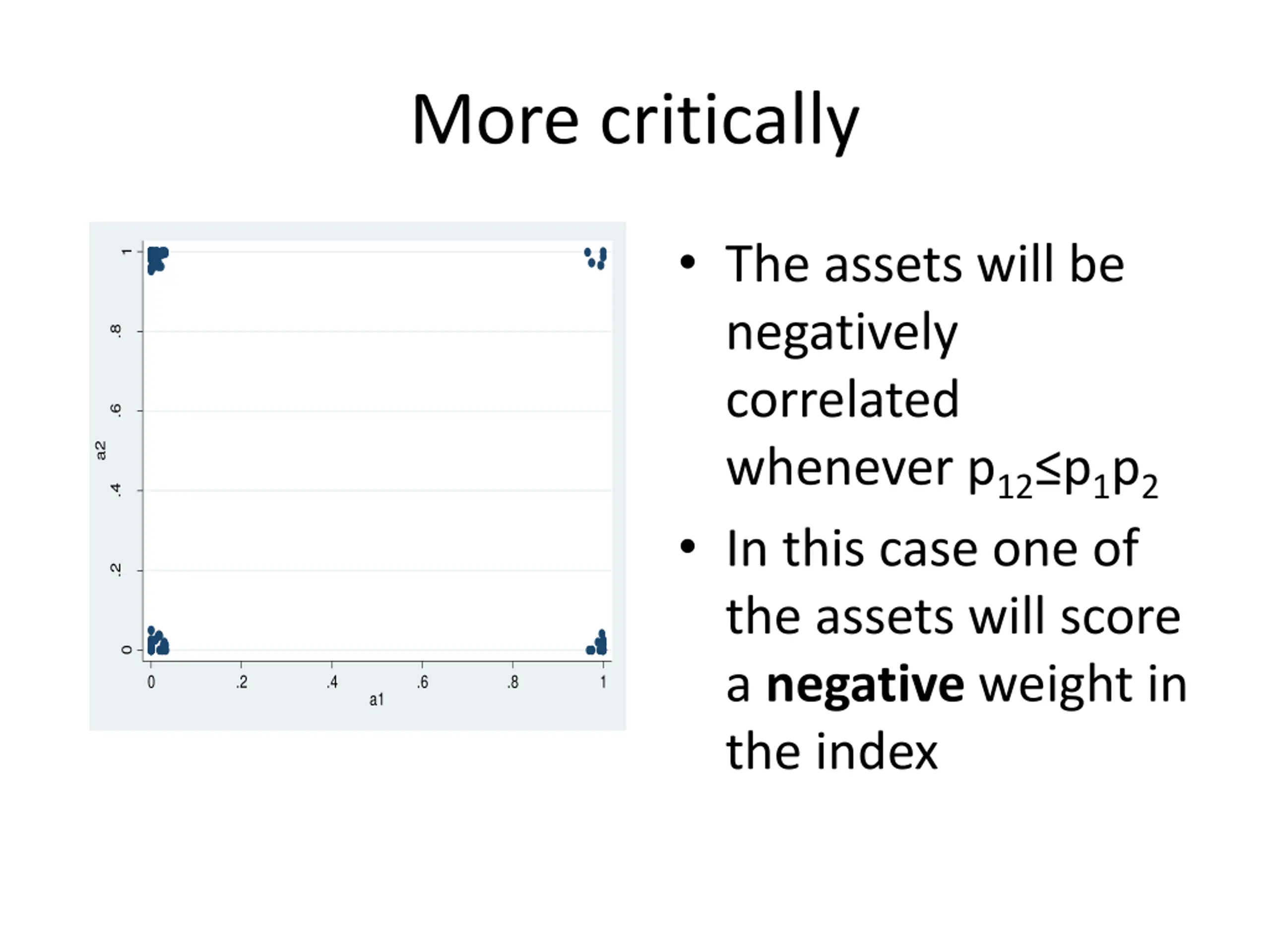 More critically The assets will be negatively correlated whenever p12 p1p2 In this case one of the assets will score a negative weight in the index 1 .8 .6 a2 .4 .2 0 0 .2 .4 .6 .8 1 a1