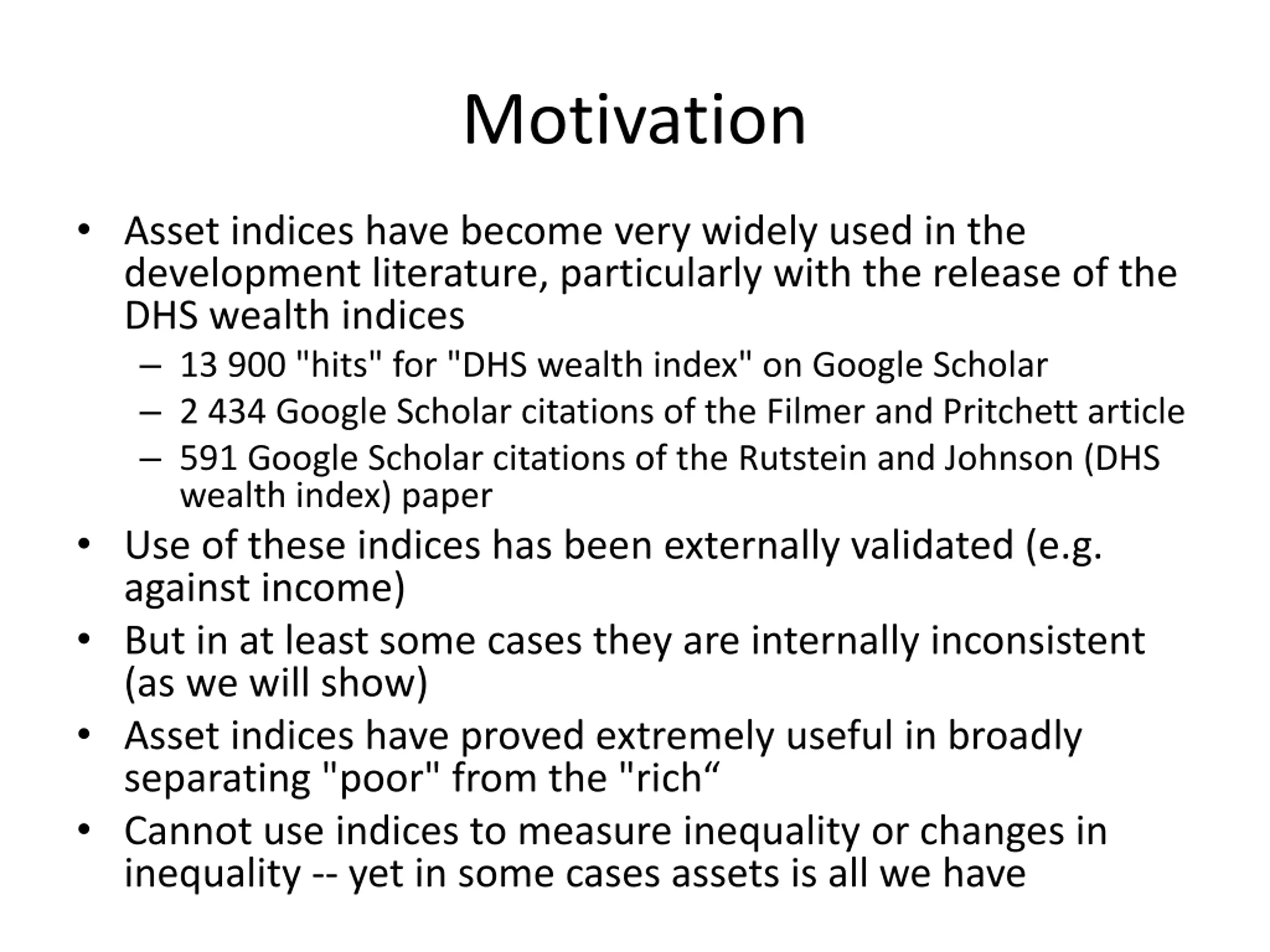 Motivation Asset indices have become very widely used in the development literature, particularly with the release of the DHS wealth indices 13 900 "hits" for "DHS wealth index" on Google Scholar 2 434 Google Scholar citations of the Filmer and Pritchett article 591 Google Scholar citations of the Rutstein and Johnson (DHS wealth index) paper Use of these indices has been externally validated (e.g. against income) But in at least some cases they are internally inconsistent (as we will show) Asset indices have proved extremely useful in broadly separating "poor" from the "rich Cannot use indices to measure inequality or changes in inequality -- yet in some cases assets is all we have
