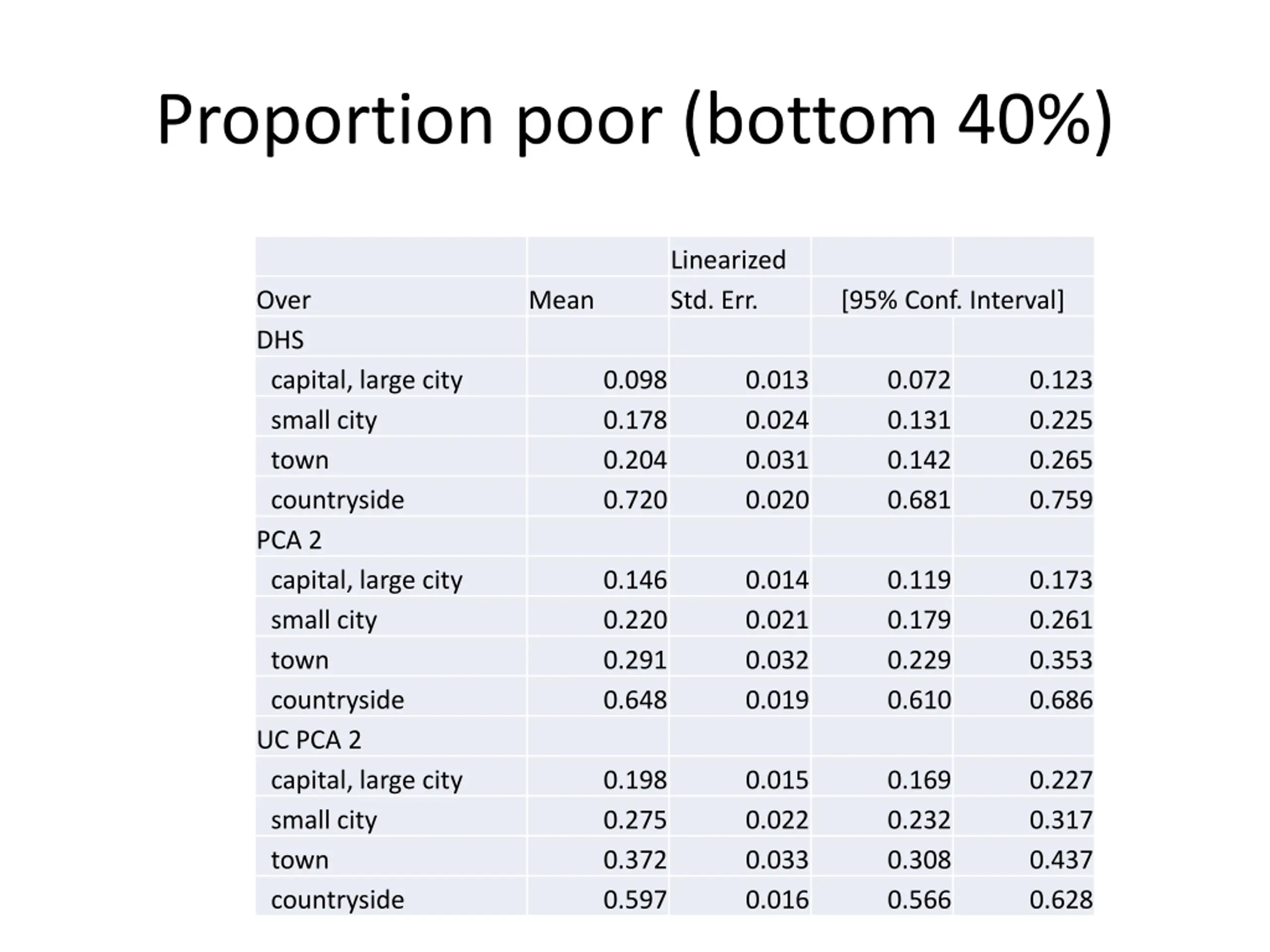 Proportion poor (bottom 40%) Linearized Std. Err. Over DHS capital, large city small city town countryside PCA 2 capital, large city small city town countryside UC PCA 2 capital, large city small city town countryside Mean [95% Conf. Interval] 0.098 0.178 0.204 0.720 0.013 0.024 0.031 0.020 0.072 0.131 0.142 0.681 0.123 0.225 0.265 0.759 0.146 0.220 0.291 0.648 0.014 0.021 0.032 0.019 0.119 0.179 0.229 0.610 0.173 0.261 0.353 0.686 0.198 0.275 0.372 0.597 0.015 0.022 0.033 0.016 0.169 0.232 0.308 0.566 0.227 0.317 0.437 0.628