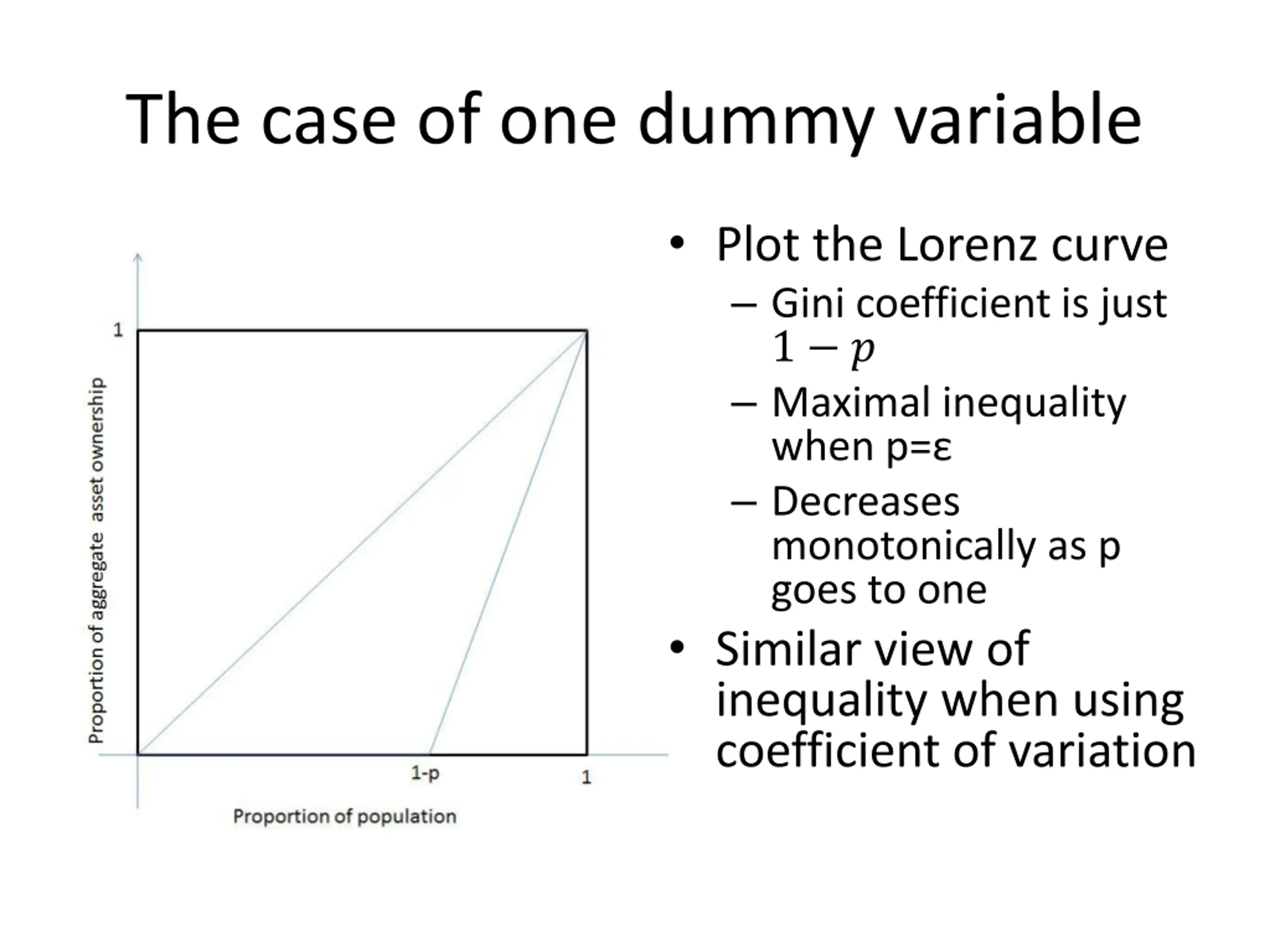 The case of one dummy variable Plot the Lorenz curve Gini coefficient is just 1 ? Maximal inequality when p= Decreases monotonically as p goes to one Similar view of inequality when using coefficient of variation