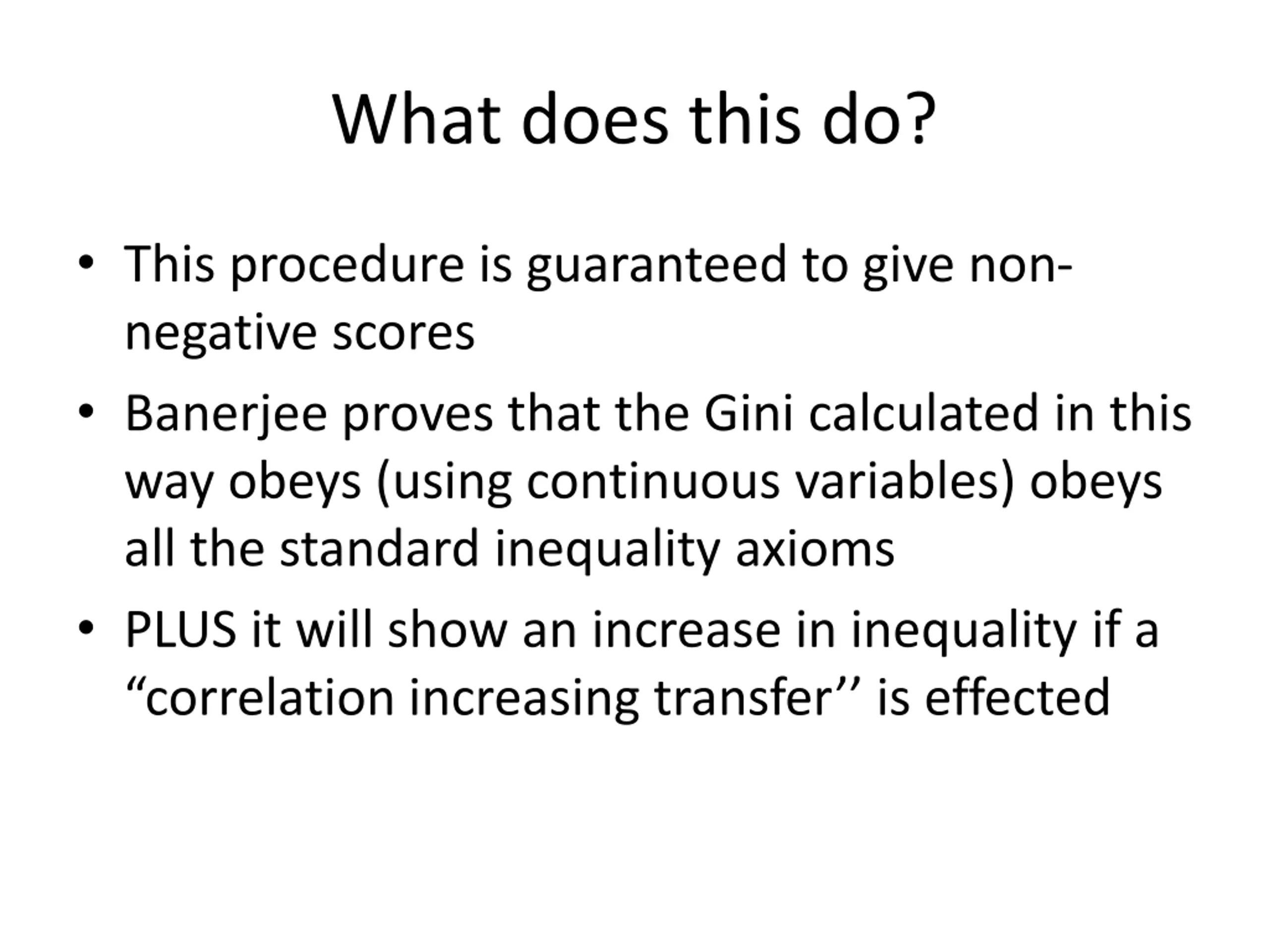 What does this do? This procedure is guaranteed to give non- negative scores Banerjee proves that the Gini calculated in this way obeys (using continuous variables) obeys all the standard inequality axioms PLUS it will show an increase in inequality if a correlation increasing transfer is effected