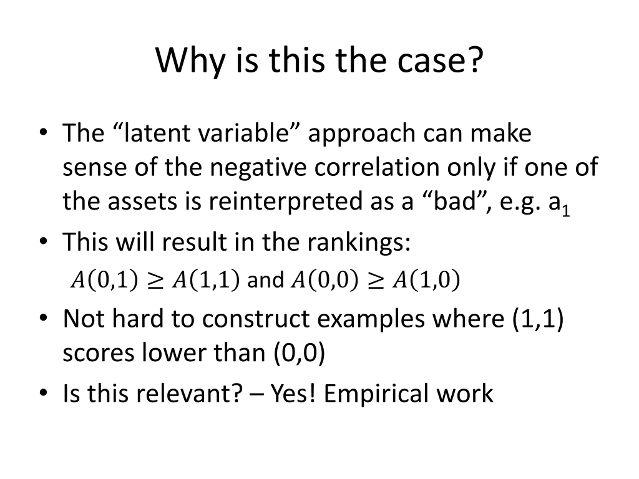 Why is this the case? The latent variable approach can make sense of the negative correlation only if one of the assets is reinterpreted as a bad , e.g. a1 This will result in the rankings: ? 0,1 ? 1,1 and ? 0,0 ? 1,0 Not hard to construct examples where (1,1) scores lower than (0,0) Is this relevant? Yes! Empirical work