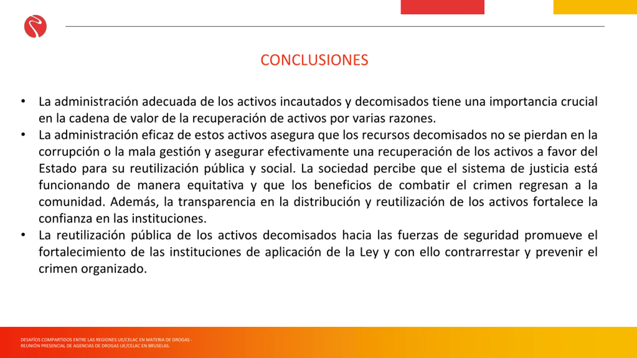 CONCLUSIONES La administraci n adecuada de los activos incautados y decomisados tiene una importancia crucial en la cadena de valor de la recuperaci n de activos por varias razones. La administraci n eficaz de estos activos asegura que los recursos decomisados no se pierdan en la corrupci n o la mala gesti n y asegurar efectivamente una recuperaci n de los activos a favor del Estado para su reutilizaci n p blica y social. La sociedad percibe que el sistema de justicia est funcionando de manera equitativa y que los beneficios de combatir el crimen regresan a la comunidad. Adem s, la transparencia en la distribuci n y reutilizaci n de los activos fortalece la confianza en las instituciones. La reutilizaci n p blica de los activos decomisados hacia las fuerzas de seguridad promueve el fortalecimiento de las instituciones de aplicaci n de la Ley y con ello contrarrestar y prevenir el crimen organizado. DESAF OS COMPARTIDOS ENTRE LAS REGIONES UE/CELAC EN MATERIA DE DROGAS - REUNI N PRESENCIAL DE AGENCIAS DE DROGAS UE/CELAC EN BRUSELAS.