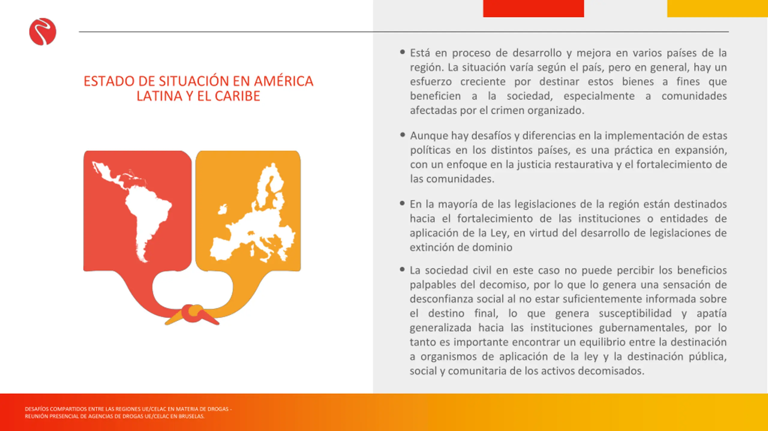 Est en proceso de desarrollo y mejora en varios pases de la regi n. La situaci n var a seg n el pa s, pero en general, hay un esfuerzo creciente por destinar estos bienes a fines que beneficien a la sociedad, especialmente a comunidades afectadas por el crimen organizado. ESTADO DE SITUACI N EN AM RICA LATINA Y EL CARIBE Aunque hay desaf os y diferencias en la implementaci n de estas pol ticas en los distintos pa ses, es una pr ctica en expansi n, con un enfoque en la justicia restaurativa y el fortalecimiento de las comunidades. En la mayor a de las legislaciones de la regi n est n destinados hacia el fortalecimiento de las instituciones o entidades de aplicaci n de la Ley, en virtud del desarrollo de legislaciones de extinci n de dominio La sociedad civil en este caso no puede percibir los beneficios palpables del decomiso, por lo que lo genera una sensaci n de desconfianza social al no estar suficientemente informada sobre el destino final, lo que genera susceptibilidad y apat a generalizada hacia las instituciones gubernamentales, por lo tanto es importante encontrar un equilibrio entre la destinaci n a organismos de aplicaci n de la ley y la destinaci n p blica, social y comunitaria de los activos decomisados. DESAF OS COMPARTIDOS ENTRE LAS REGIONES UE/CELAC EN MATERIA DE DROGAS - REUNI N PRESENCIAL DE AGENCIAS DE DROGAS UE/CELAC EN BRUSELAS.