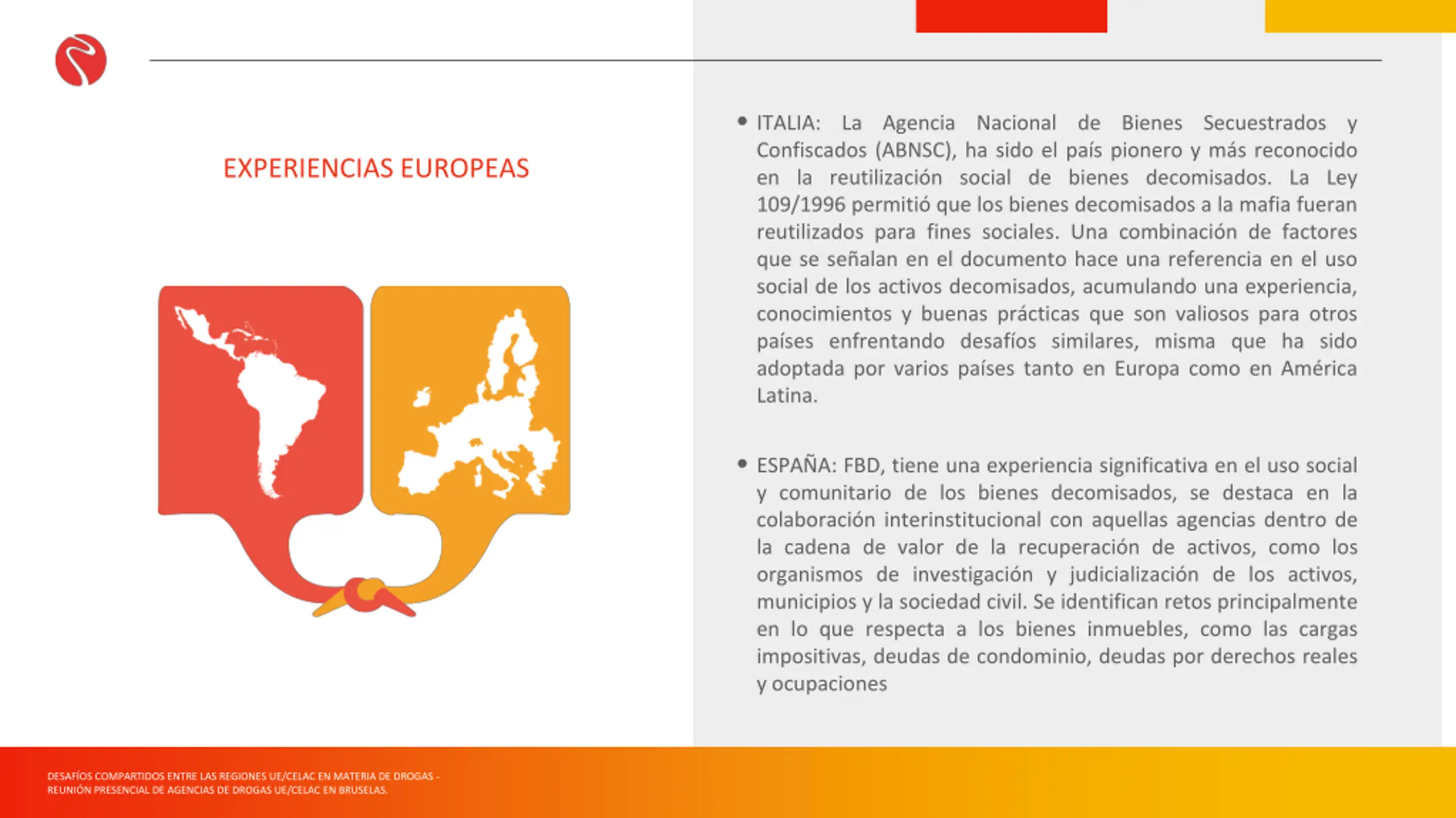 ITALIA: Confiscados (ABNSC), ha sido el pa s pionero y m s reconocido en la reutilizaci n social de bienes decomisados. La Ley 109/1996 permiti que los bienes decomisados a la mafia fueran reutilizados para fines sociales. Una combinaci n de factores que se se alan en el documento hace una referencia en el uso social de los activos decomisados, acumulando una experiencia, conocimientos y buenas pr cticas que son valiosos para otros pa ses enfrentando desaf os similares, misma que ha sido adoptada por varios pa ses tanto en Europa como en Am rica Latina. La Agencia Nacional de Bienes Secuestrados y EXPERIENCIAS EUROPEAS ESPA A: FBD, tiene una experiencia significativa en el uso social y comunitario de los bienes decomisados, se destaca en la colaboraci n interinstitucional con aquellas agencias dentro de la cadena de valor de la recuperaci n de activos, como los organismos de investigaci n y judicializaci n de los activos, municipios y la sociedad civil. Se identifican retos principalmente en lo que respecta a los bienes inmuebles, como las cargas impositivas, deudas de condominio, deudas por derechos reales y ocupaciones DESAF OS COMPARTIDOS ENTRE LAS REGIONES UE/CELAC EN MATERIA DE DROGAS - REUNI N PRESENCIAL DE AGENCIAS DE DROGAS UE/CELAC EN BRUSELAS.