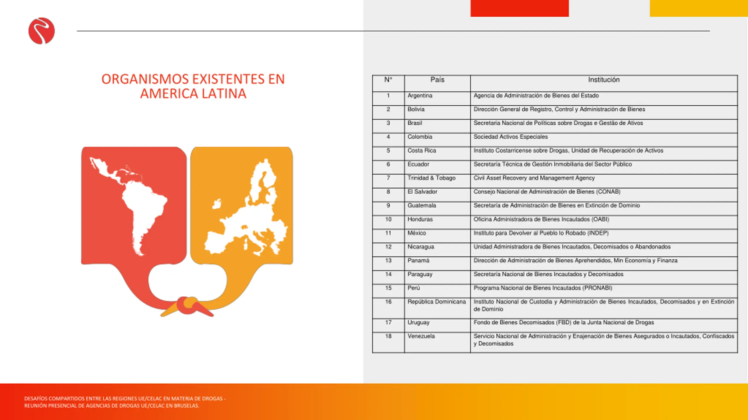 ORGANISMOS EXISTENTES EN AMERICA LATINA N Pa s Instituci n 1 Argentina Agencia de Administraci n de Bienes del Estado 2 Bolivia Direcci n General de Registro, Control y Administraci n de Bienes 3 Brasil Secretaria Nacional de Pol ticas sobre Drogas e Gest o de Ativos 4 Colombia Sociedad Activos Especiales 5 Costa Rica Instituto Costarricense sobre Drogas, Unidad de Recuperaci n de Activos 6 Ecuador Secretar a T cnica de Gesti n Inmobiliaria del Sector P blico 7 Trinidad & Tobago Civil Asset Recovery and Management Agency 8 El Salvador Consejo Nacional de Administraci n de Bienes (CONAB) 9 Guatemala Secretar a de Administraci n de Bienes en Extinci n de Dominio 10 Honduras Oficina Administradora de Bienes Incautados (OABI) 11 M xico Instituto para Devolver al Pueblo lo Robado (INDEP) 12 Nicaragua Unidad Administradora de Bienes Incautados, Decomisados o Abandonados 13 Panam Direcci n de Administraci n de Bienes Aprehendidos, Min Econom a y Finanza 14 Paraguay Secretar a Nacional de Bienes Incautados y Decomisados 15 Per Programa Nacional de Bienes Incautados (PRONABI) 16 Rep blica Dominicana Instituto Nacional de Custodia y Administraci n de Bienes Incautados, Decomisados y en Extinci n de Dominio 17 Uruguay Fondo de Bienes Decomisados (FBD) de la Junta Nacional de Drogas 18 Venezuela Servicio Nacional de Administraci n y Enajenaci n de Bienes Asegurados o Incautados, Confiscados y Decomisados DESAF OS COMPARTIDOS ENTRE LAS REGIONES UE/CELAC EN MATERIA DE DROGAS - REUNI N PRESENCIAL DE AGENCIAS DE DROGAS UE/CELAC EN BRUSELAS.