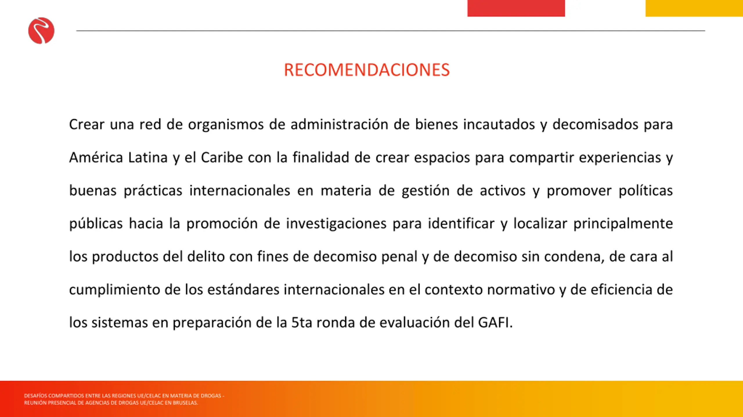 RECOMENDACIONES Crear una red de organismos de administraci n de bienes incautados y decomisados para Am rica Latina y el Caribe con la finalidad de crear espacios para compartir experiencias y buenas pr cticas internacionales en materia de gesti n de activos y promover pol ticas p blicas hacia la promoci n de investigaciones para identificar y localizar principalmente los productos del delito con fines de decomiso penal y de decomiso sin condena, de cara al cumplimiento de los est ndares internacionales en el contexto normativo y de eficiencia de los sistemas en preparaci n de la 5ta ronda de evaluaci n del GAFI. DESAF OS COMPARTIDOS ENTRE LAS REGIONES UE/CELAC EN MATERIA DE DROGAS - REUNI N PRESENCIAL DE AGENCIAS DE DROGAS UE/CELAC EN BRUSELAS.