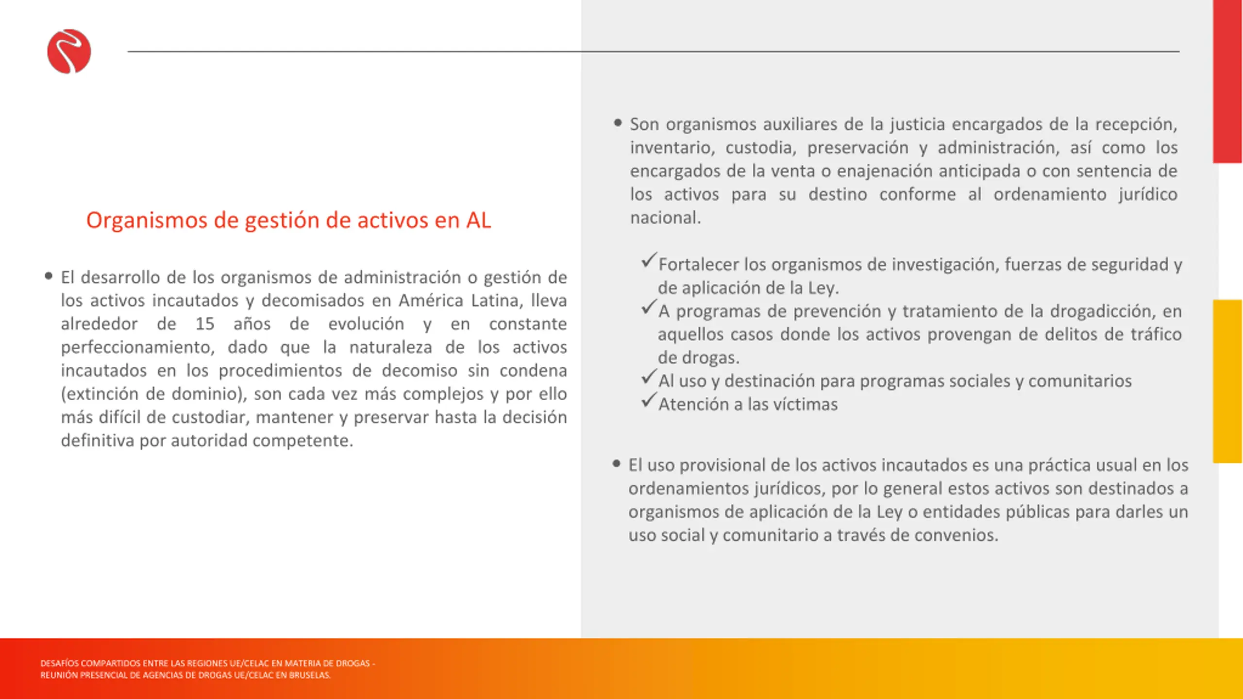 Son organismos auxiliares de la justicia encargados de la recepcin, inventario, custodia, preservaci n y administraci n, as como los encargados de la venta o enajenaci n anticipada o con sentencia de los activos para su destino conforme al ordenamiento jur dico nacional. Organismos de gesti n de activos en AL Fortalecer los organismos de investigaci n, fuerzas de seguridad y de aplicaci n de la Ley. A programas de prevenci n y tratamiento de la drogadicci n, en aquellos casos donde los activos provengan de delitos de tr fico de drogas. Al uso y destinaci n para programas sociales y comunitarios Atenci n a las v ctimas El desarrollo de los organismos de administraci n o gesti n de los activos incautados y decomisados en Am rica Latina, lleva alrededor de 15 a os de perfeccionamiento, dado que la naturaleza de los activos incautados en los procedimientos de decomiso sin condena (extinci n de dominio), son cada vez m s complejos y por ello m s dif cil de custodiar, mantener y preservar hasta la decisi n definitiva por autoridad competente. evoluci n y en constante El uso provisional de los activos incautados es una pr ctica usual en los ordenamientos jur dicos, por lo general estos activos son destinados a organismos de aplicaci n de la Ley o entidades p blicas para darles un uso social y comunitario a trav s de convenios. DESAF OS COMPARTIDOS ENTRE LAS REGIONES UE/CELAC EN MATERIA DE DROGAS - REUNI N PRESENCIAL DE AGENCIAS DE DROGAS UE/CELAC EN BRUSELAS.