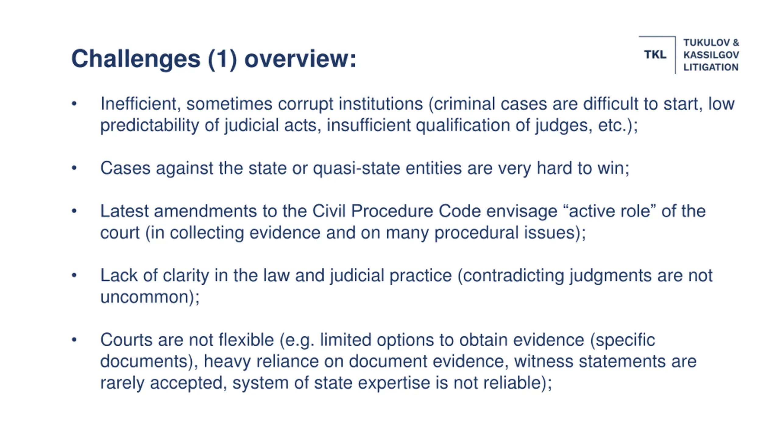 Challenges (1) overview: Inefficient, sometimes corrupt institutions (criminal cases are difficult to start, low predictability of judicial acts, insufficient qualification of judges, etc.); Cases against the state or quasi-state entities are very hard to win; Latest amendments to the Civil Procedure Code envisage active role of the court (in collecting evidence and on many procedural issues); Lack of clarity in the law and judicial practice (contradicting judgments are not uncommon); Courts are not flexible (e.g. limited options to obtain evidence (specific documents), heavy reliance on document evidence, witness statements are rarely accepted, system of state expertise is not reliable);