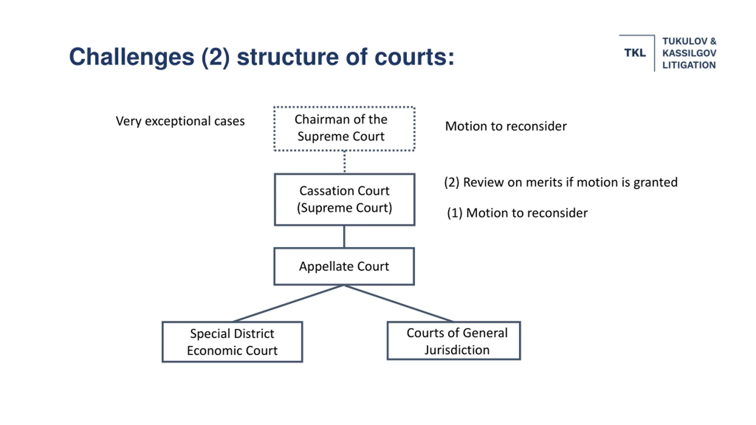 Challenges (2) structure of courts: Chairman of the Supreme Court Very exceptional cases Motion to reconsider (2) Review on merits if motion is granted Cassation Court (Supreme Court) (1) Motion to reconsider Appellate Court Courts of General Jurisdiction Special District Economic Court